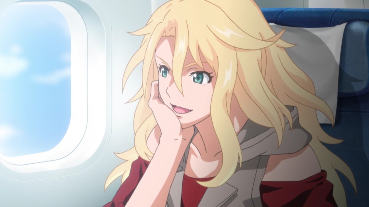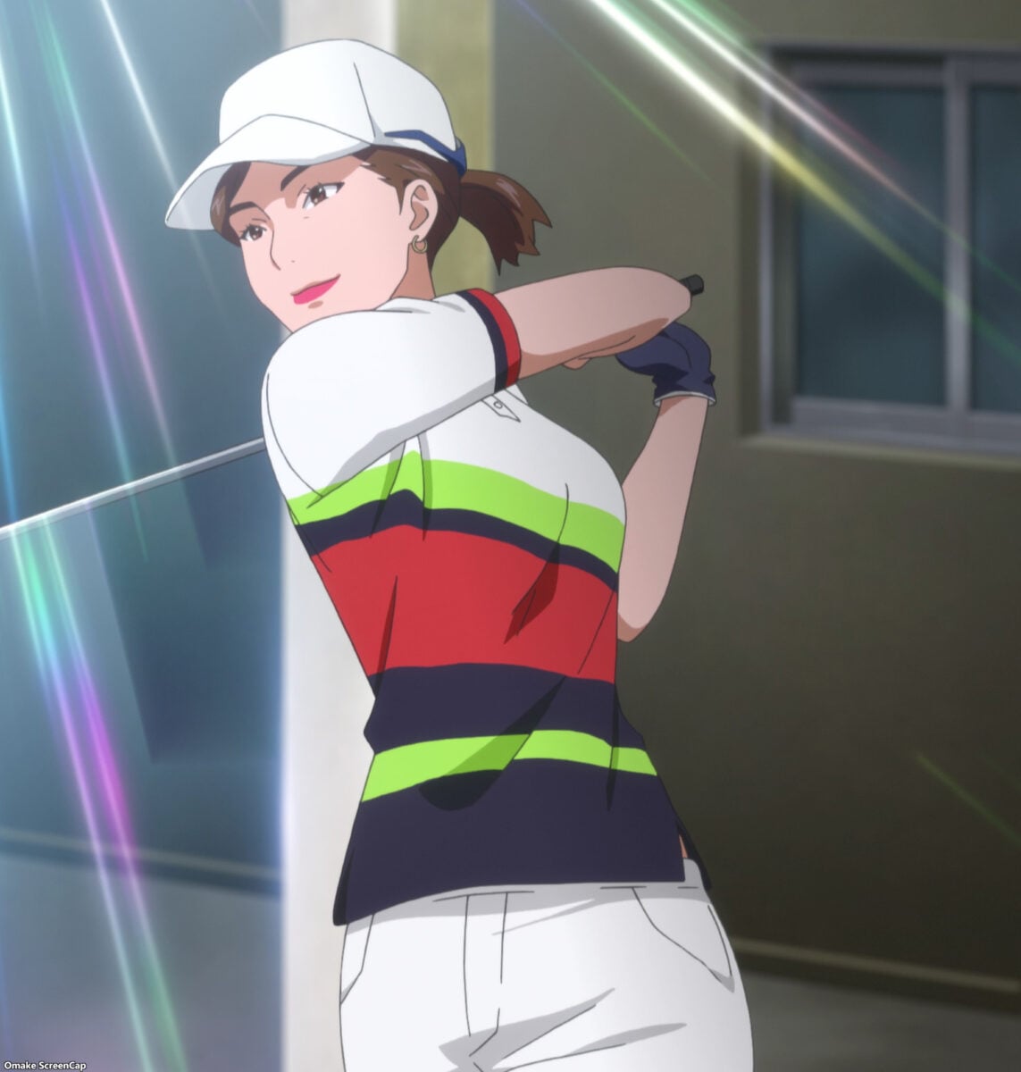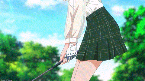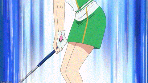 So believable. The principal just took Eve’s word that she quit school. Geez. Amane and Ichina are nosy. Their eavesdropping gave them Eve’s secret identity. Amane cryptically calls herself a “hostage” to the Amawashis. Branch family drama in Japan? Never heard of it. Oh. Aoi received a side quest too. She must develop her personal style of golf by October to beat Reika Shikishima and become a top pro golfer. That should be easy. The girl only practices with a real-world golf pro, Momoko Osato! Lame. BIRDIE WING didn’t give the pro a speaking role. At least the anime dressed her in BIRDIE WING’s official merchandise.