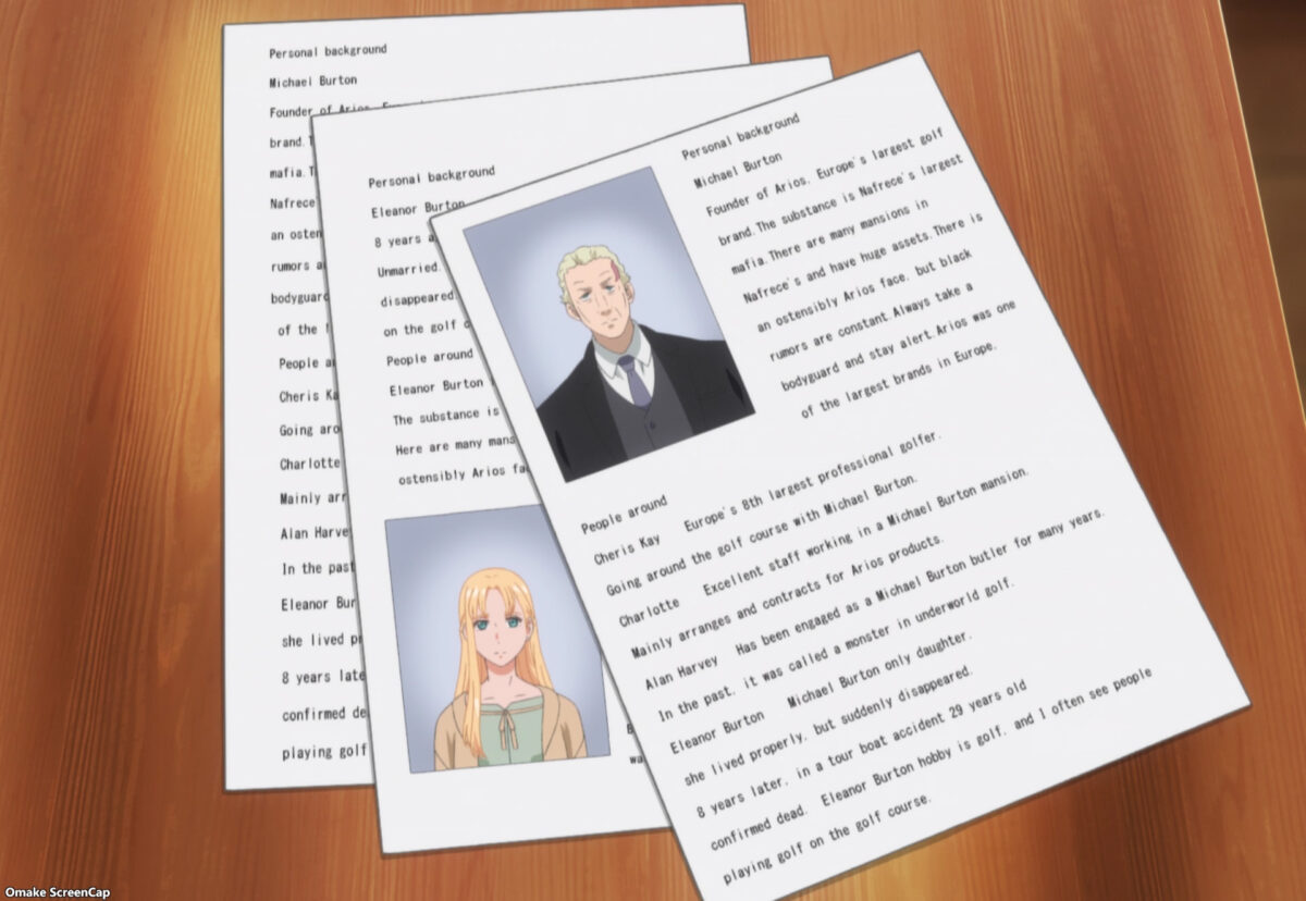 Good old Nafrece. I never made the connection that the logo on the airport was a lion. I’ll pay attention to that! Yay! Vipère looks happy. And Eve still knows how to charm the ladies. Oh no. Young ones should not play with Lily’s Gundam models. I’m still waiting for Bandai Namco to restart the Gunpla commercials in BIRDIE WING. Nice. Vipère is still lovey-dovey with “Darling,” the bodyguard from Nicolas’s organization. Please don’t read the English text on the Burton dossiers too closely because it will start to look like lorem ipsum placeholders. Oh? The logo for the mafia-backed golf brand Arios is a lion! Whoops. That’s not funny! Eve is the granddaughter of Michael Burton! Oh, yeah. Catherine still has a bounty on Eve, so the Burtons could erase that.