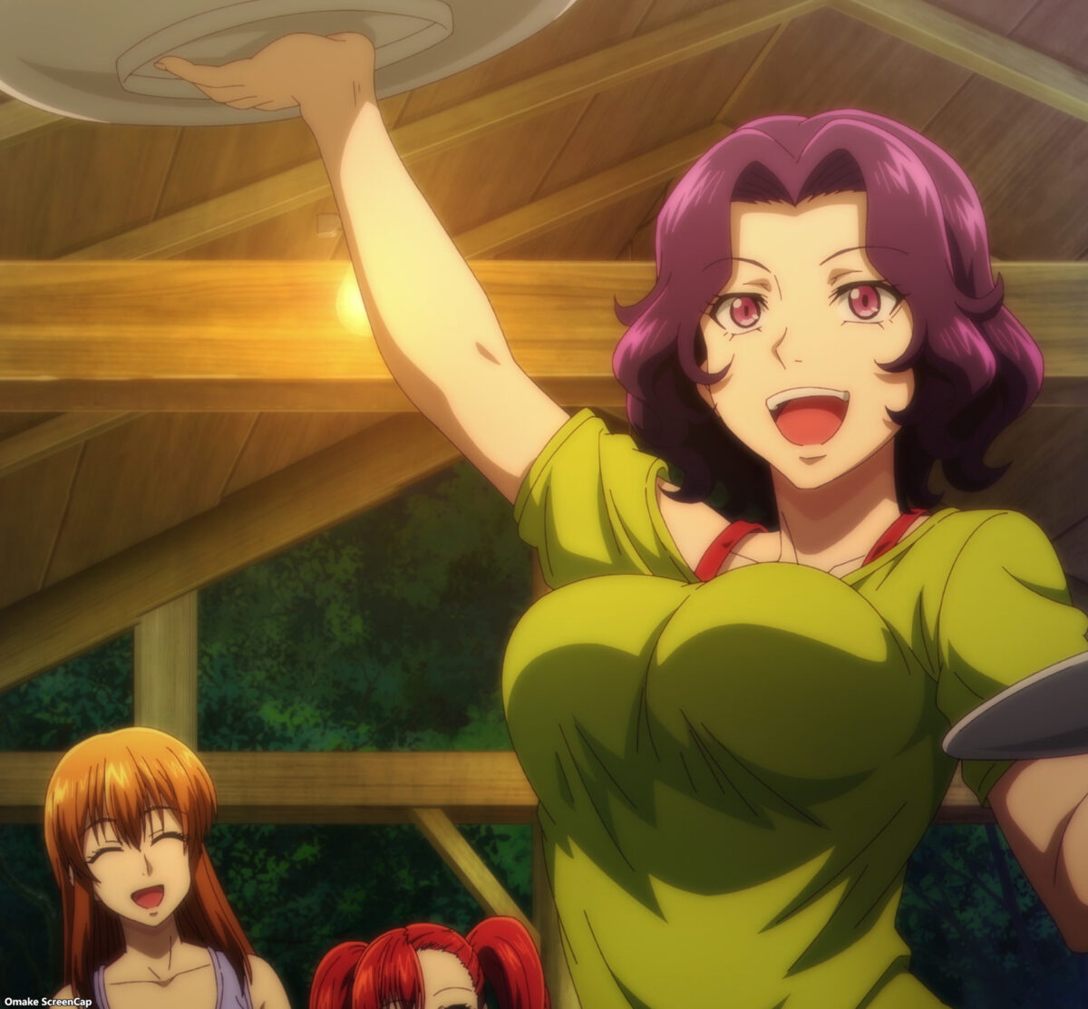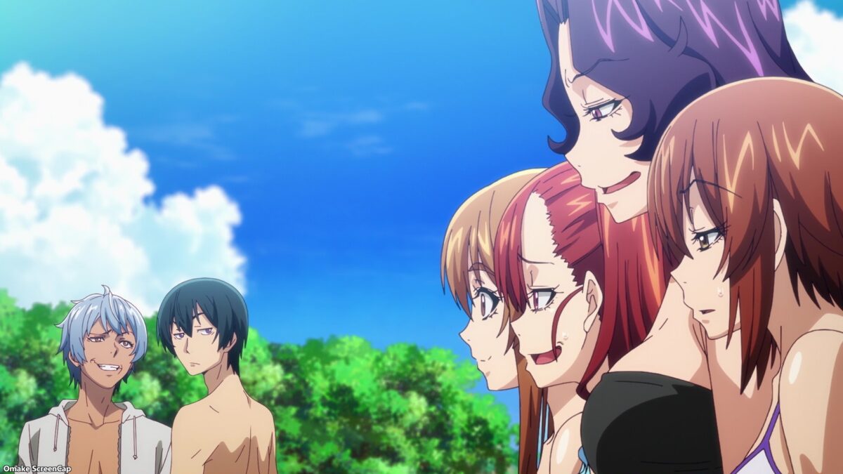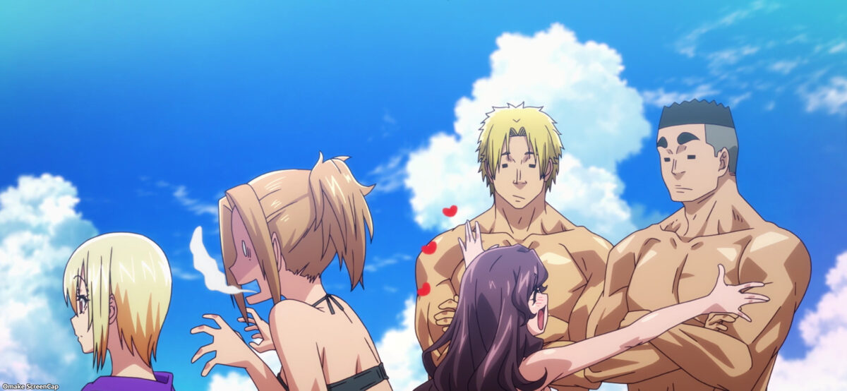 Yes. Yes! It’s bikini time! Azusa and Iori celebrate. What the…? Oh no! Peek-a-boo’s rival club, Tinkerbell, is also on the island! And Sakurako, too! Was it a blessing that Aina went home to her family farm instead of meeting these people who ridiculed her in the first season of Grand Blue? Sakurako’s friends are even thirstier than she is. That doesn’t sit well with the Tinkerbell dudes when their guests only care about the Peek-a-boo guys and Naomi. Worse, the Peek-a-boo girls hate the Tinkerbell guys.