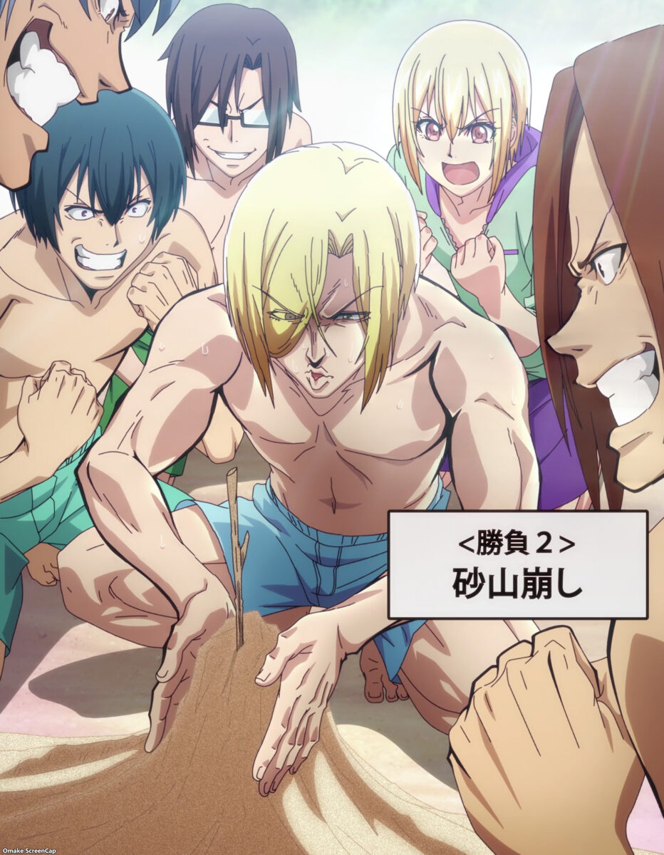 Hey! It’s the Grand Blue beach episode! Let’s decide who hangs out with whom through beach games! Wait a minute. They’ve just been hanging out together!