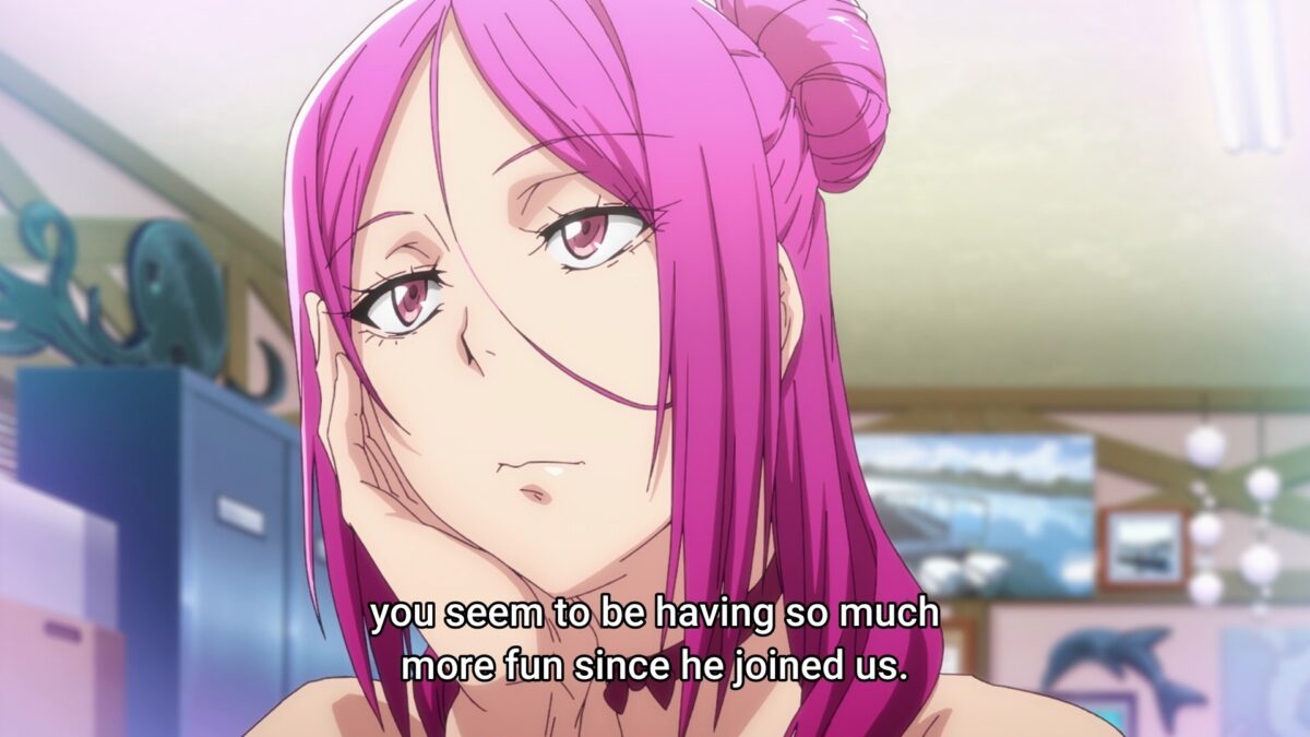 Uh oh. Sakurako saw Naomi excitedly talking with Chisa. More misunderstandings. Chisa only wants to talk about diving with Naomi, not Iori. Sakurako still claims she only likes Naomi for his handsomeness. Chisa has no idea why Iori would “intrigue” Naomi. Familiarity breeds contempt, right? Iori’s efforts to distract Naomi from Chisa backfire. Opposites attract, and Iori’s eating, drinking, and loudness draw Naomi’s attention.