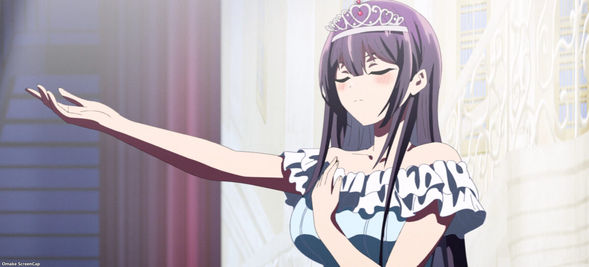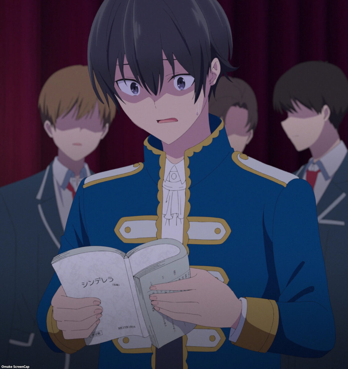 Flash-forward to Koushi and Takane’s first scene together in Cinderella. Is it a beautiful disaster or an ugly success? Let’s find out! We rejoin Takamine-san’s official timeline after the opening credits. Ellie and Rurika are in the auditorium, and Ellie has her distraction oshi fan (“Takane-chan, Look over here”). Here’s Takane in her Cinderella costume. Rurika tries to shush Ellie’s inappropriate cheering. How are Koushi’s nerves doing? The Prince Charming role doesn’t have many lines, but he has to stand on stage for most of the second half.