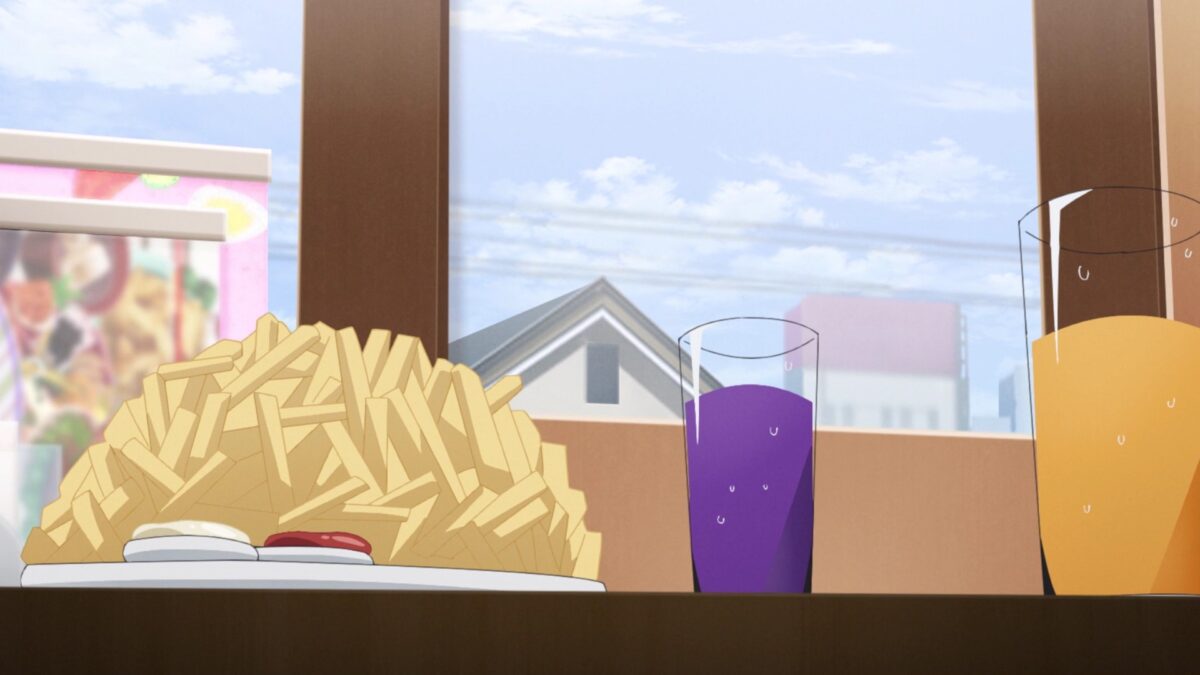Wow. So much happens in this Takamine-san episode that it doesn’t show the opening credit sequence. Or there’s so much yakking that the editors couldn’t cut out 90 seconds of it. Sure, I believe it. Takane “coincidentally” walked by Ellie and Koushi’s cram school as it let out for the day. Ellie suggests hanging out at a family restaurant. That’s a staple of slice-of-life anime characters wasting time. Hello, new character, Rurika! She’s the emotionless, sleepy type. She gives Ellie extra fries. I wonder why! Takane doesn’t eat many carbs to maintain her figure. Of course.