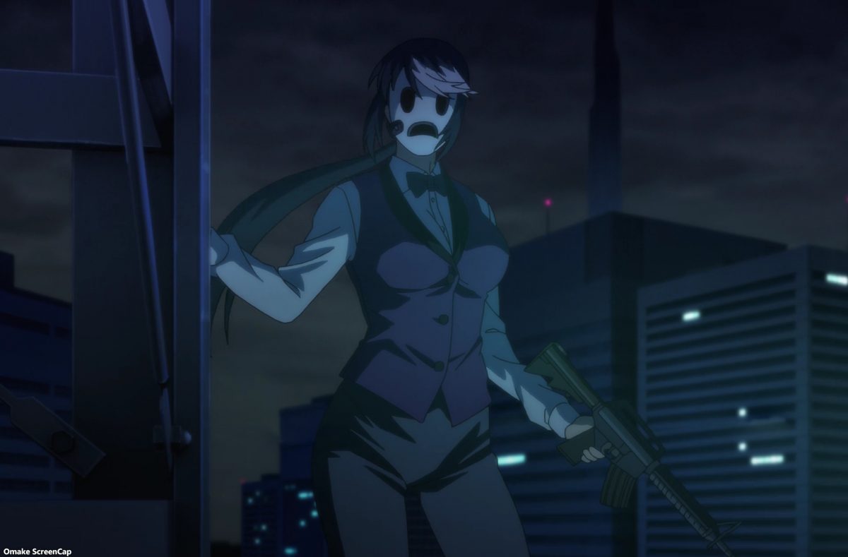 The Netflix splash screen hearkens back to High Rise Invasion’s first episode. There’s Dealer Mask not doing anything again. Yayoi looks sick. What happened? Archangel climbs up the side of the skyscraper. That means he could climb down. What happens if he does that? Of course. He caught Sniper Mask’s bullet! Archangel is so deluded. He thinks everyone who attacks him works for Aikawa.