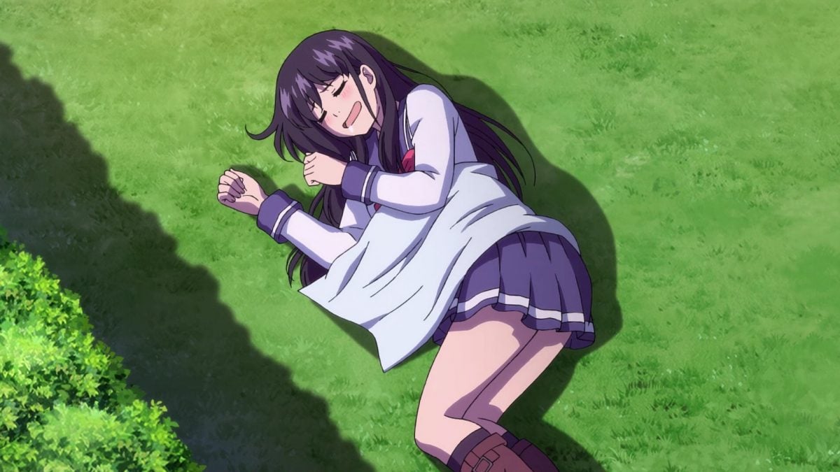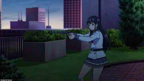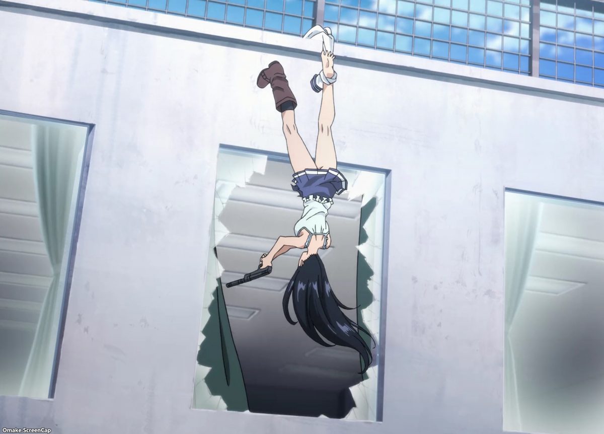 Almost-God Kuon has an almost-Guardian Angel in Sniper Mask. He’ll watch over Kuon until she can find another group of people to cooperate with her. Har. Kuon doesn’t like how Sniper Mask calls her “woman,” but he doesn’t care. Kuon gives good pout. She’s a fine addition to the funny stuff in High Rise Invasion. Ha! Yuri wants to call Mayuko “Big Sister!” So much blushing. Aw. It’s a nice moment for Mayuko because she grew up in abusive conditions at an orphanage.
