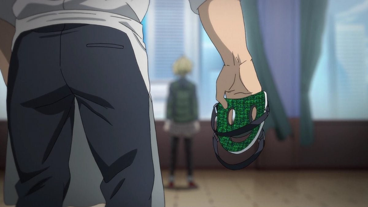 Back to Sniper Mask meeting God-potential, recapping their encounter from the previous High Rise Invasion episode. Almost-God’s name is Kuon Shinzaki. She’s so happy to talk to someone.