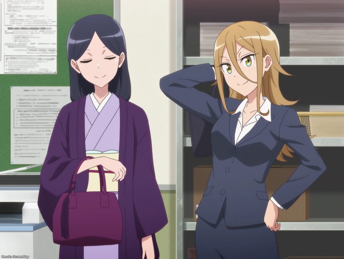 There were still some fun things to notice, like Kure-sensei’s character employing the anime convention of someone keeping their eyes closed. It’s played to great effect to highlight a dramatic moment, a shocking revelation about the character, or even just to hide how special their eyes might look. The mysterious Kure-sensei, who dresses so traditionally, hints at being part of a clan with dark secrets. Her demon eyes and ogre strength play that up comedically too!