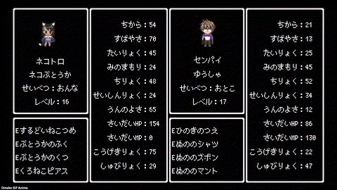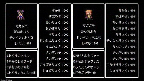 The eye catches show 8-bit style character pages. Nekotoro is a Cat Fighter, naturally. The demon lord girls have all maxed out levels, except for Magayoshi. Her Intelligence Levels remain in single digits, and she gets dumber in her dragon demon lord mode!