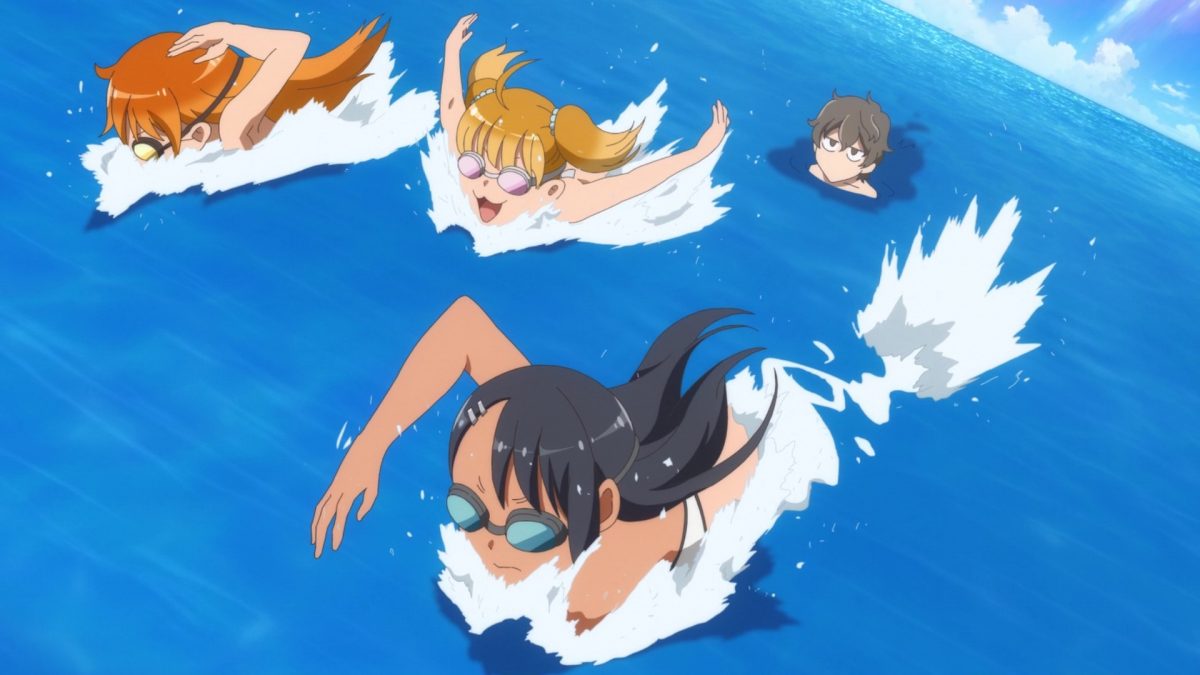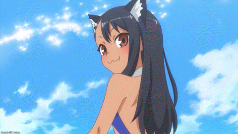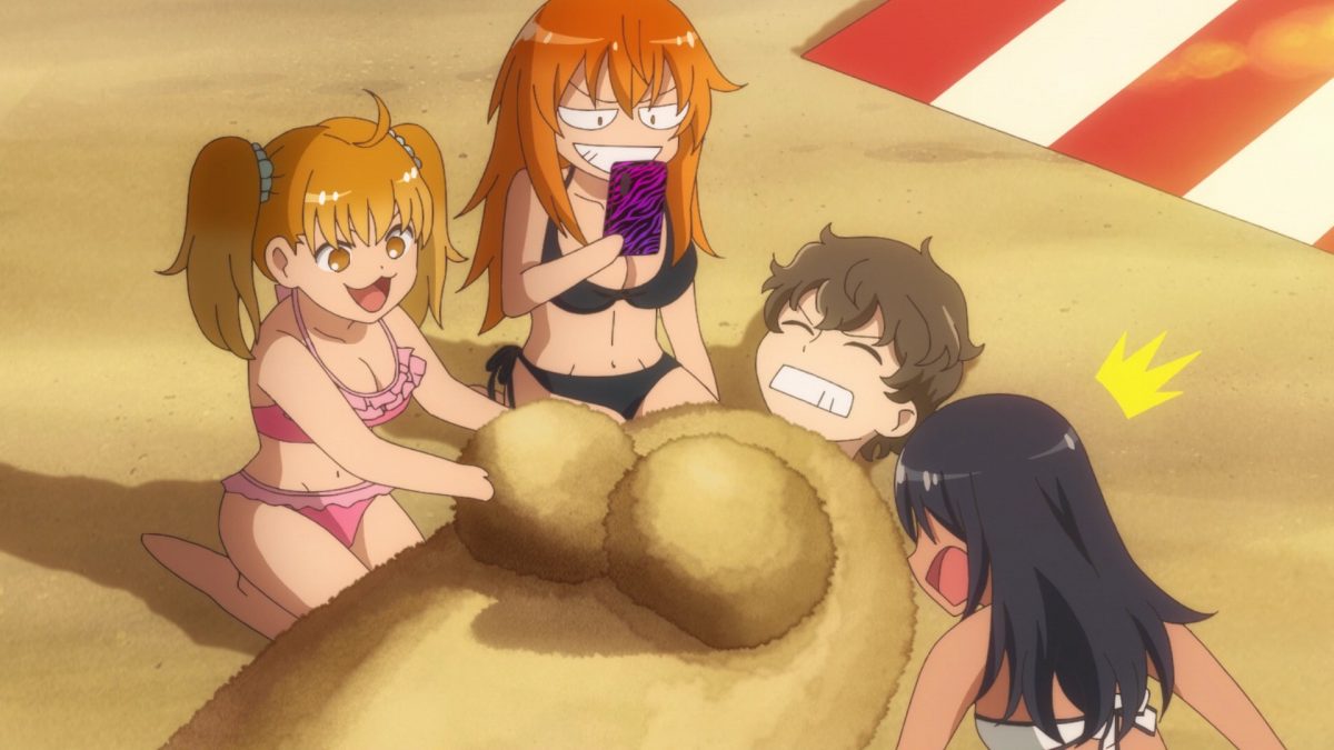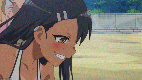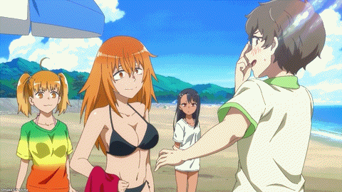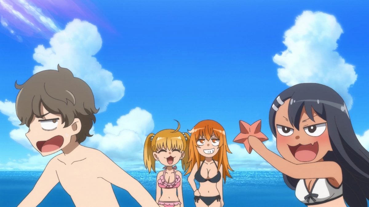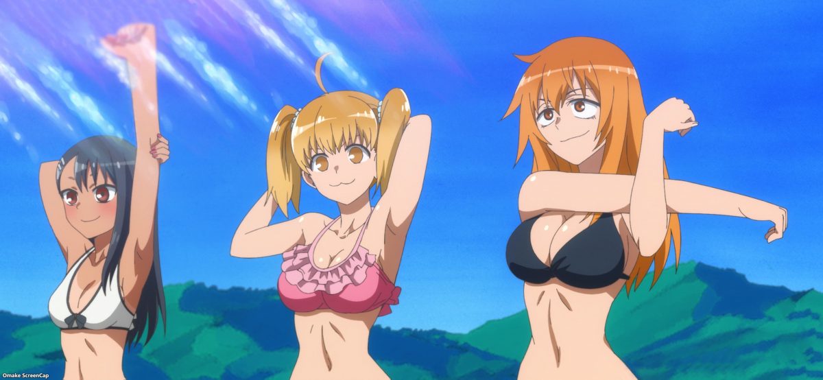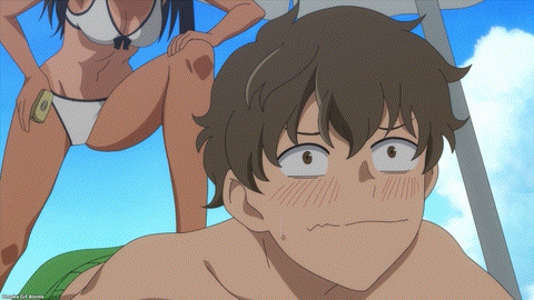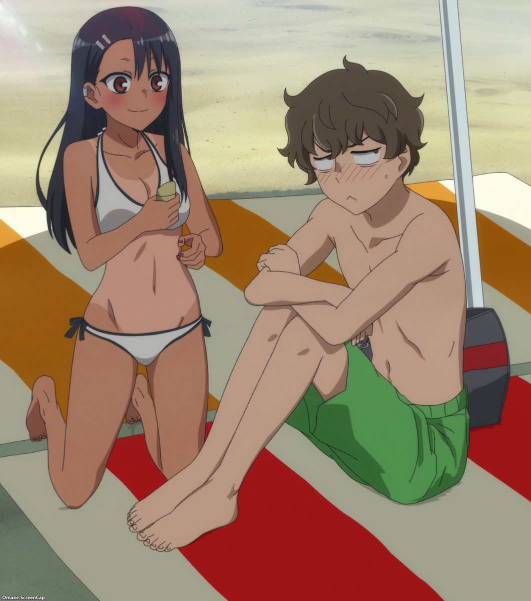 Yes. YES. YES! It’s the Ijiranaide, Nagatoro-san beach episode! Tan gals in bikinis! Tan Nagatoro in a bikini! Tan Nagatoro in a bikini showing her tan lines! Deep breath. Let’s go!