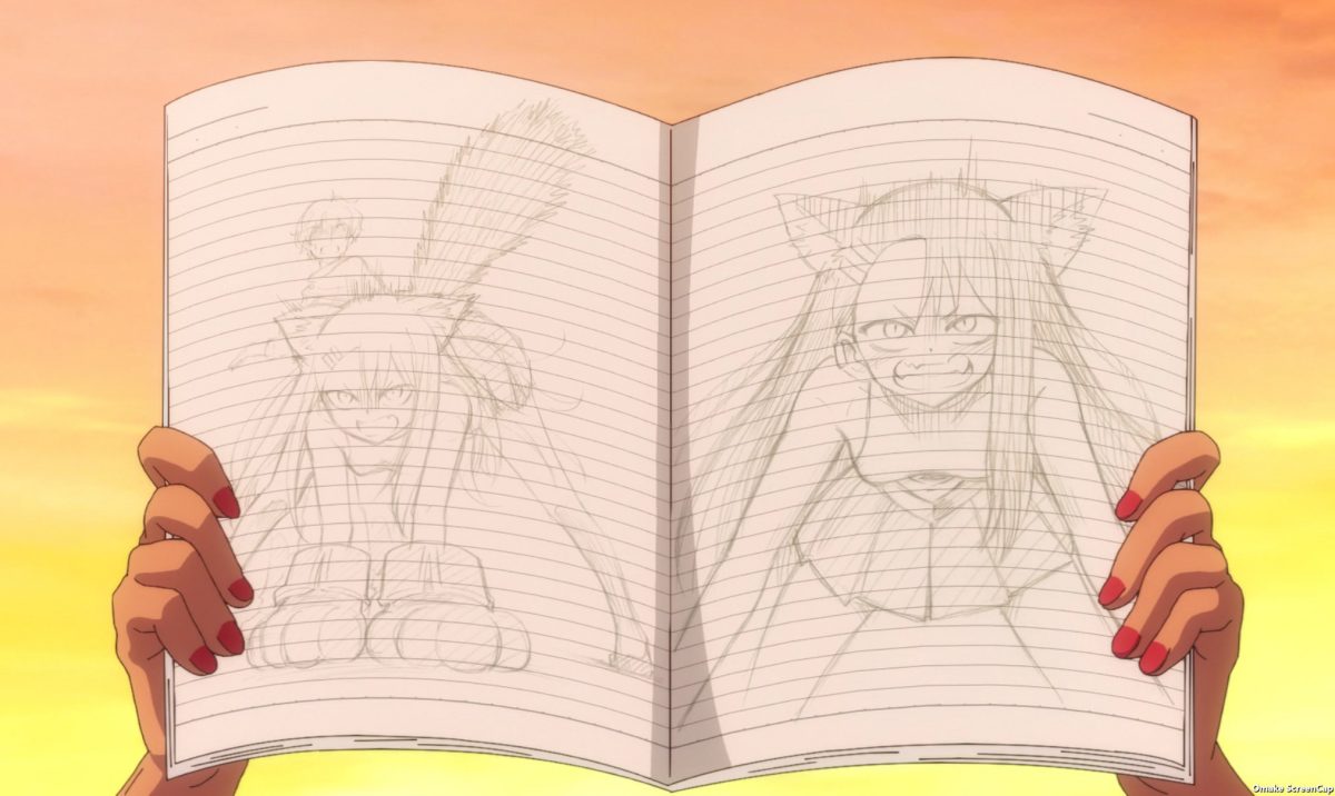 Ha, of course. Ijiranaide, Nagatoro-san made it all a dream. Senpai fell asleep in his favorite diner while drawing something. Nice timing. Nagatoro and friends showed up right then. They wear nice gyaru summer fashion. Hoho! He drew Nekotoro and Nagatoro loves it!