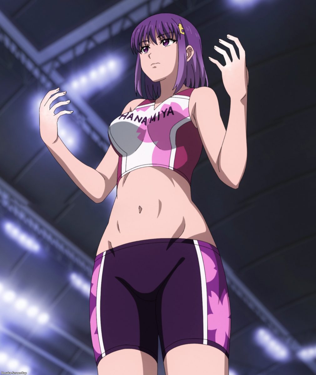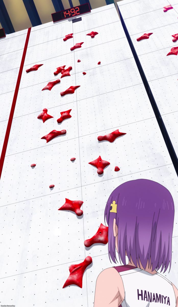 Asuka joined the announcing crew. No foot-to-face action here. Konomi starts off with one-shots. Nakata hates “Murder Observation,” because Konomi is beautiful. Icky man! Whoa. Hanamiya got the highest team score in the B-Group prelims for bouldering. One goal cleared. Woof. Anne’s school swept the top spots for the speed wall in the A-Group. Iwakakeru! sets up a big showdown in the semifinals. Konomi made a personal best on the speed wall, but it’s still two seconds slower than Anne and Mimu. Will she make a breakthrough in the season finale?