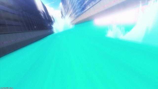 This is a little far-fetched, but it’s anime, so what the heck. This whole district, other schools, and the boats move out of the way for an impromptu Jet Race. Now I know why those parts of the suit lit up. Jet Racing is strip laser tag on a tandem jet ski! No wonder this sport is so popular.