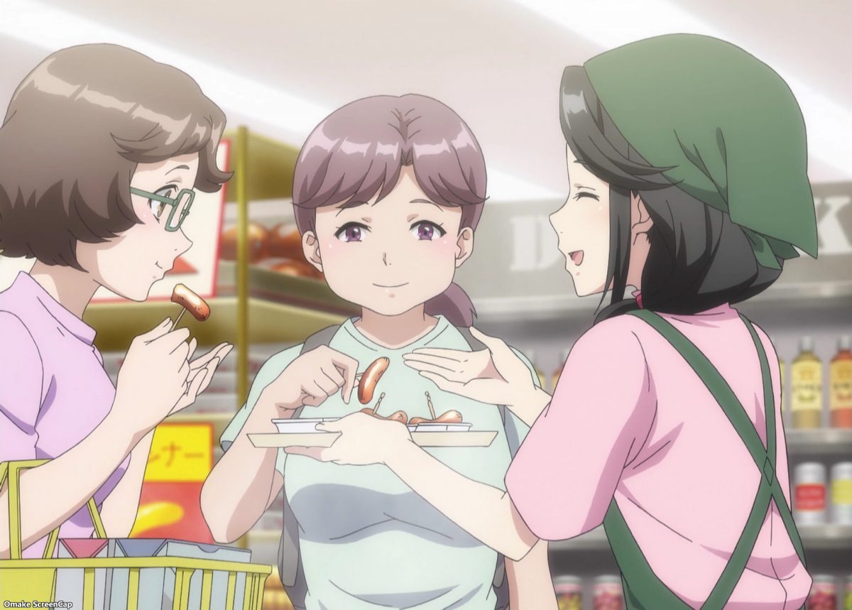 Aw. Shy Kiriko has social anxiety. Don’t eat the samples, Hina! Ah! Hina likes the sausage. That squeal of delight will sell a lot of meat today.
