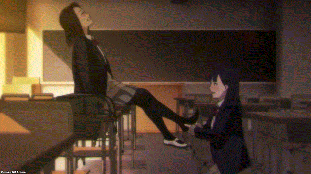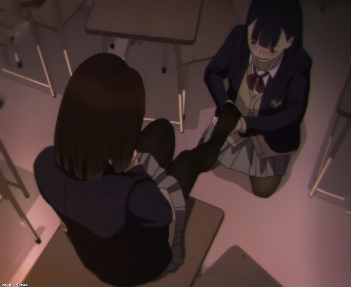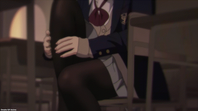 This episode’s setup for showing off sexy legs and sexy feet in tights is Yua and Ren having their own version of an after-school tryst with a yuri vibe. We saw how excited Yua was during detention to tease Ren’s feet, and she got her chance at an extended session this week with some “helpful” foot massage. I had a good chuckle with how the dialogue and reactions to Yua’s rough treatment of Ren’s pressure points sounded and looked just like hentai anime. I mean, so I’ve heard…