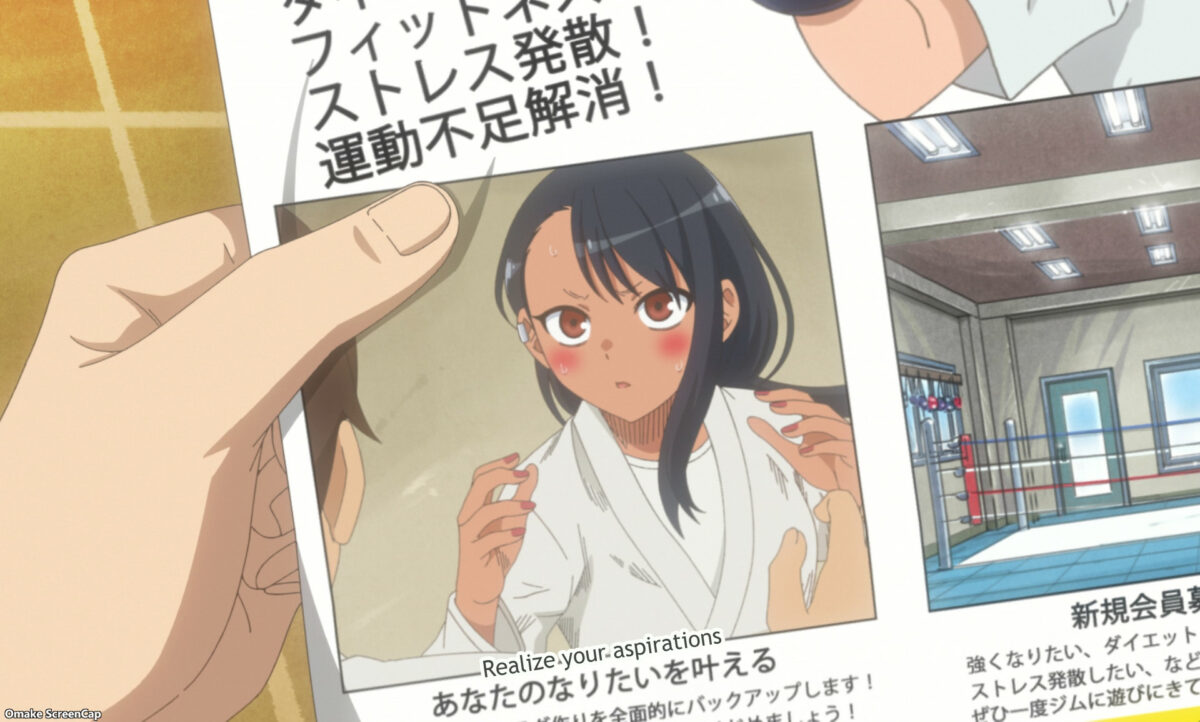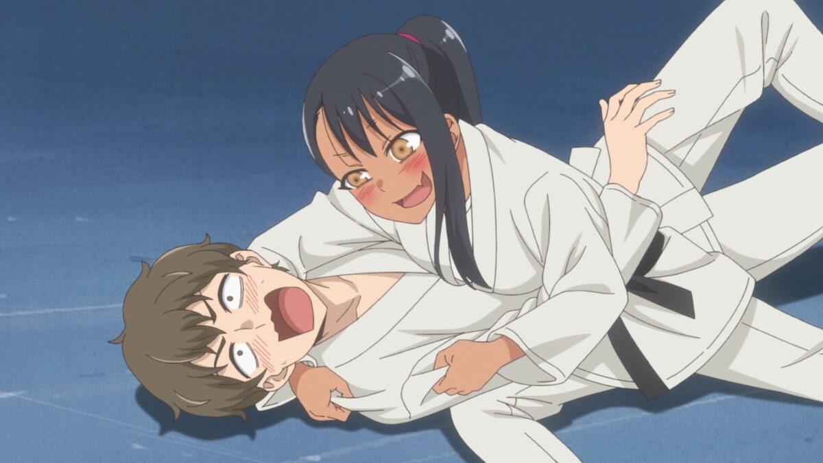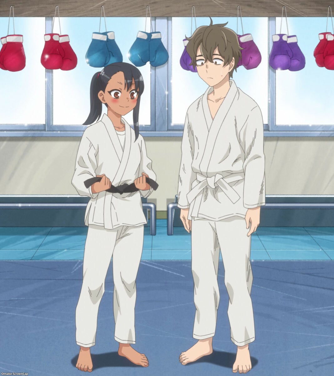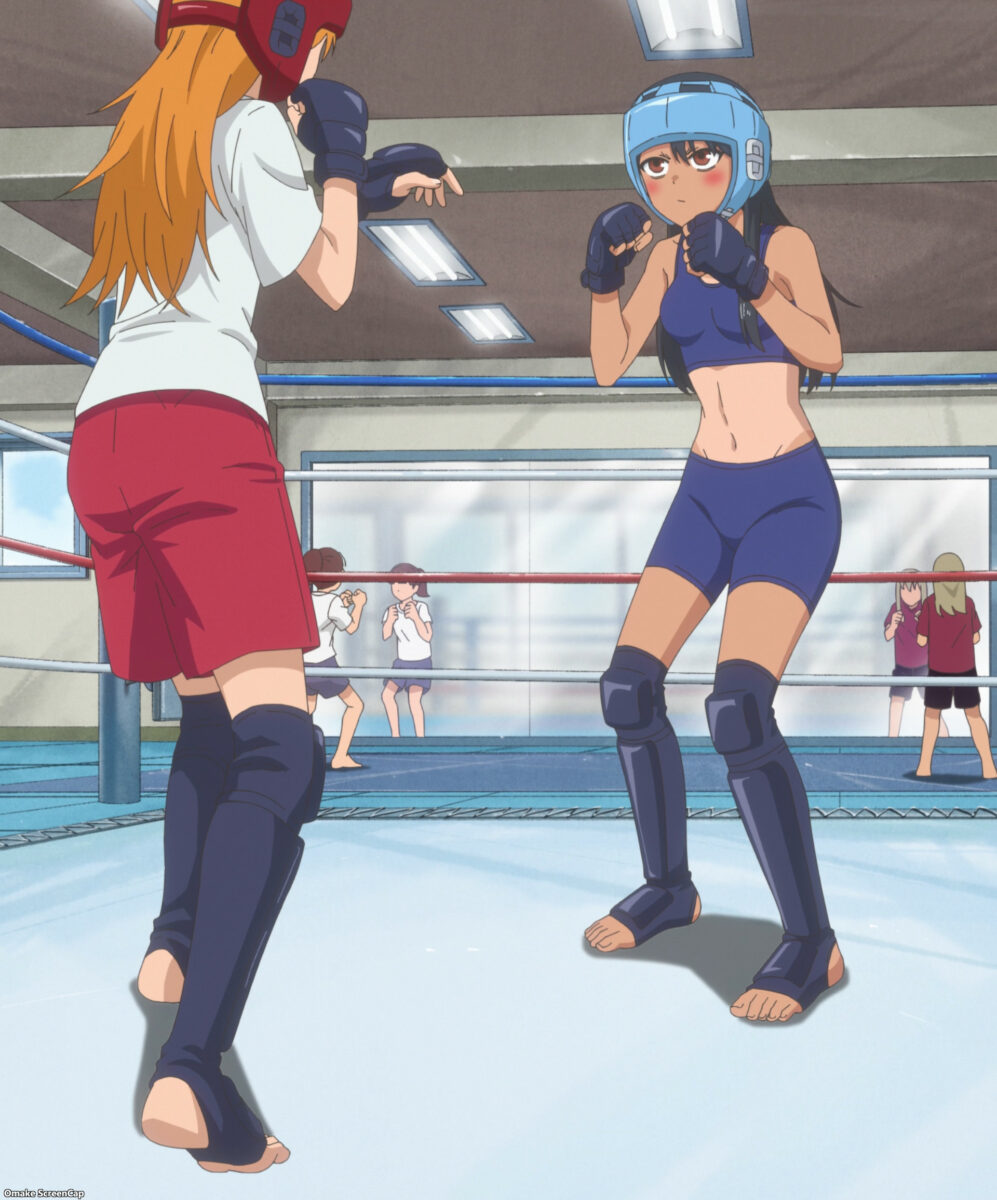 Senpai recognizes Nagatoro’s judo stance when she poses for him. Nagatoro spars with Senpai at Gamou’s family gym.