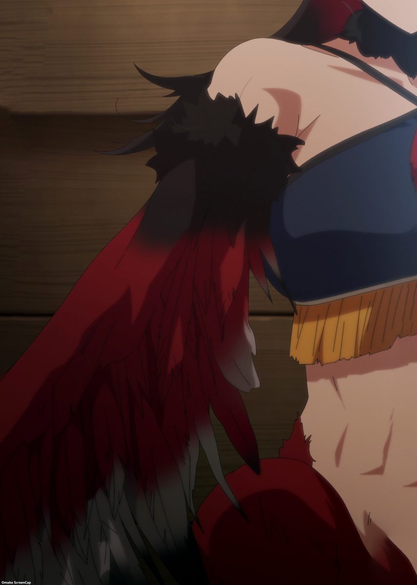 As for the medical exam scene of Dr. Glenn pulling on a monster girl’s feathers, I came away confused again by chimera anatomy and physiological development. Birds mature similarly to other animals, where all the adult characteristics show up in puberty. Birds can’t fly until they’ve molted their fledgling wing feathers, and their adult feathers appear at the same time as their sex organs develop. When Monster Girl Doctor claims that Illy could fly and lay eggs before completing her fledgling molt, I need to shut down that part of my brain. Perhaps Illy’s adult feathers are a secondary molt like humans have wisdom teeth? Are harpies merely different? Do their children start flying around when well-formed feathers come in like when humans lose their baby teeth? Monster Girl Doctor’s premise hole would have never appeared if it weren’t Illy that needed help laying an egg in that previous episode. But since the narrative requires a prior emotional connection, details become less important. A leopard never changes its spots, but a harpy in this world can change its plumage.
