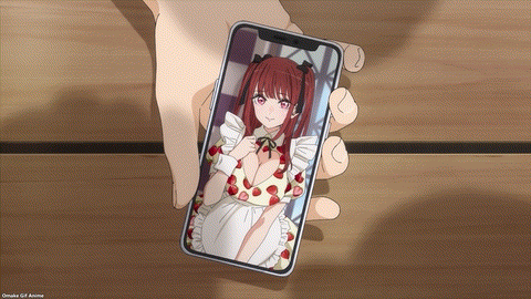 The cosplayer for a character from Space Idols Cosmic Lovers has a secret. He’s a dude who cross-dresses as female characters. Gojou’s most pressing question about Amane is why he carries liquid glue around in his makeup kit. Why? Why, why, why? Meanwhile, Marin reconnected with her photographer friend, Suzuka. She convinced Suzuka to play Slippery Girls to better understand Shizuka-tan. But, how authentic did Marin make her Shizuka-tan cosplay? Is she haitenai underneath? No! Boo! My Dress-Up Darling framed her shorts out of the shot! Oh. Amane satisfied Gojou’s curiosity about the glue: he uses it for gluing his wig hair around his cheeks to change the shape of his face. He showed Marin and Gojou his portfolio, which impressed them for two reasons. Two big reasons!