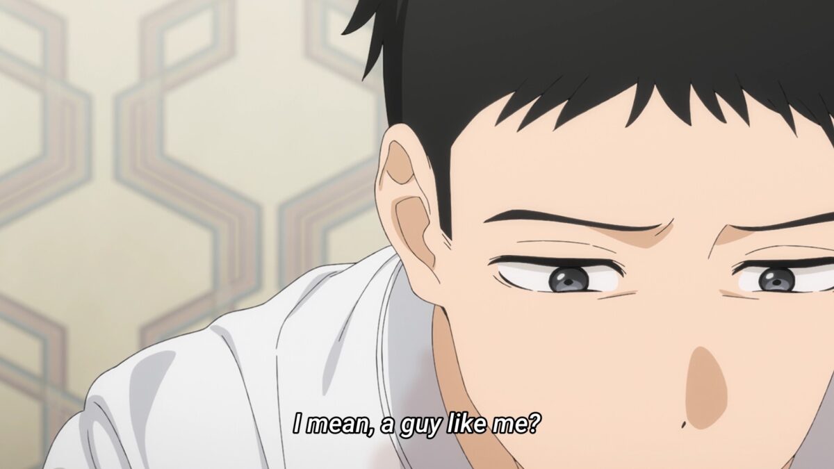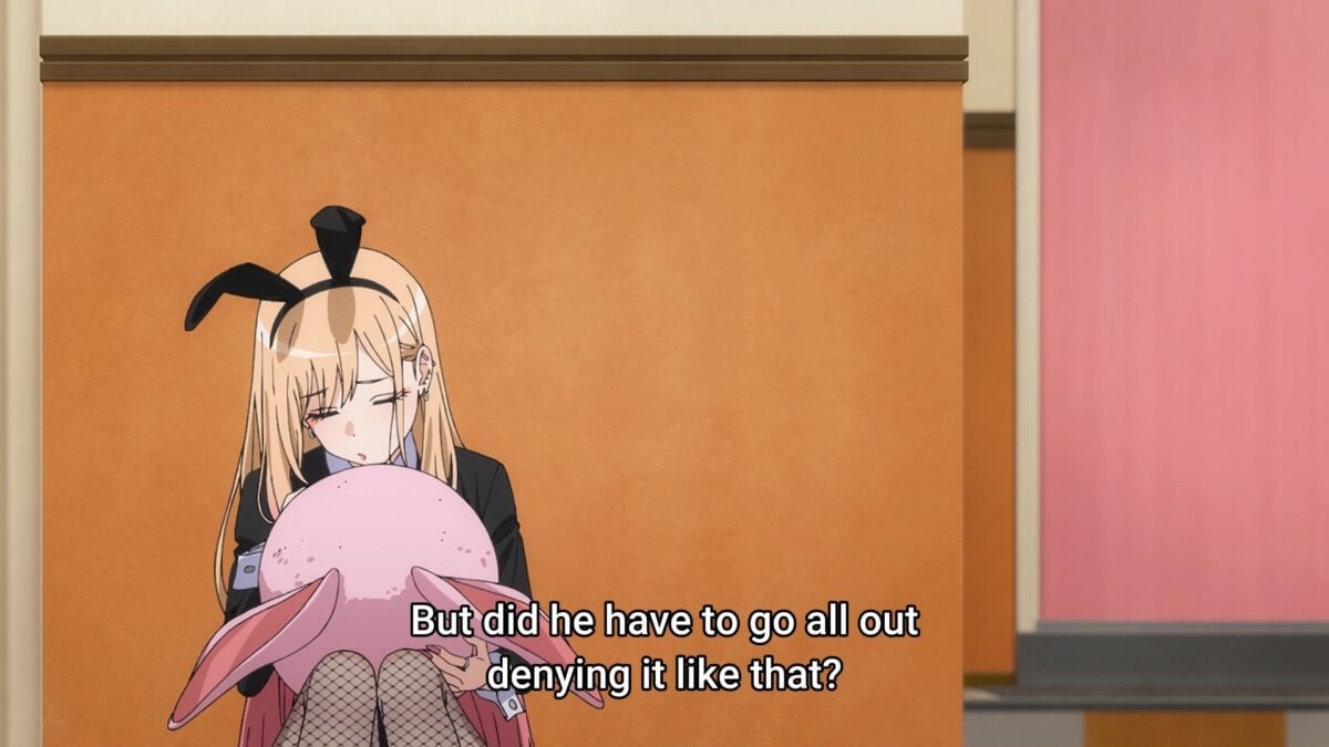 Oh, right. Marin realized Gojou was trying to protect her! She wuvs him! Chuu! Ahahaha! Gojou even misinterpreted that kissing sound as a tongue click. Not his best night. Oops. Marin can’t admit she kissed Gojou’s costume’s cheek. Oh, another sound. Achoo!