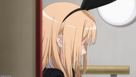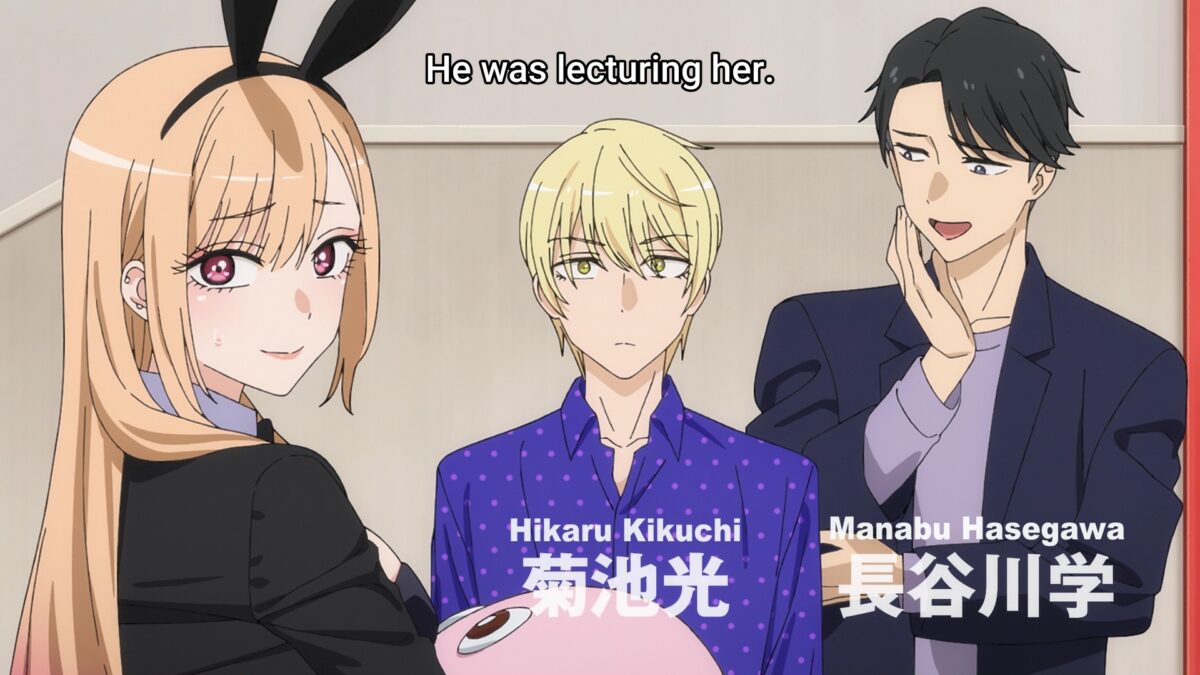 Uh oh. Who is this angry, handsome man? Former boyfriend? The guy behind him doesn’t have an expression matching an anxious situation. Ack. My Dress-Up Darling will make Gojou embarrassingly misinterpret things, creating an awkward scene. I notice that Marin chose fishnets with a hard seam for her bunny girl suit. Hahaha! What is Gojou saying here? He’s volunteering to replace Marin for whatever this blond, angry man wants her to do? Hello, bisexual Gojou-kun! What a panicky young man. Awkward. Hoho. The pair of ikemen are gay hairdressers! The blond one hates how much Marin damages her beautiful hair! He’s even concerned she’ll catch a cold because her costume is so skimpy. This counts as foreshadowing in My Dress-Up Darling. Aw. The dudes know who Gojou is.