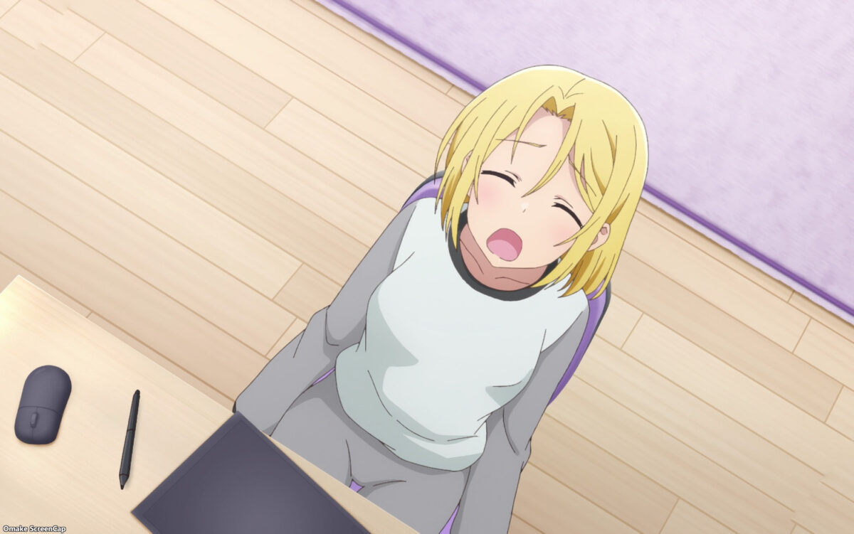 Ah. Chinatsu needed to unload her frustrations on Shinozaki about how Mr. Manager discovered her otaku hobbies. Aha! Even her childhood friend doesn’t know about her cosplay side. Chinatsu is a pro digital designer, so it makes sense that Shinozaki knew about her manga drawing. Of course, she draws BL doujinshi. Filthy fujoshi! I kid. But now Mr. Manager knows about that too! He’s so nosy. Aw. Chinatsu got a cat in her lap! I love these callback jokes.