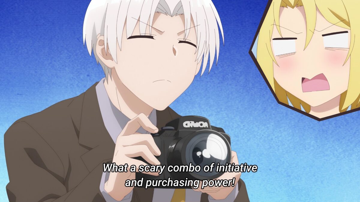 Ah. There is Mr. Manager’s stalking nature. He doesn’t want to cosplay but wants to take pictures instead! Adults with money are scary! In the last episode, Shinozaki made the same declaration about Shiori for her 300-dollar crane game budget. I hope the Crunchyroll translator finds more phrases for “purchasing power” because that will get old fast. Oho. Cosplay date for next month! But in exchange, Mr. Manager has to look up the anime and manga characters she’ll be cosplaying. This is how otakus procreate — evangelism. She’s so cute! It’s not fair how easily he can say those things!