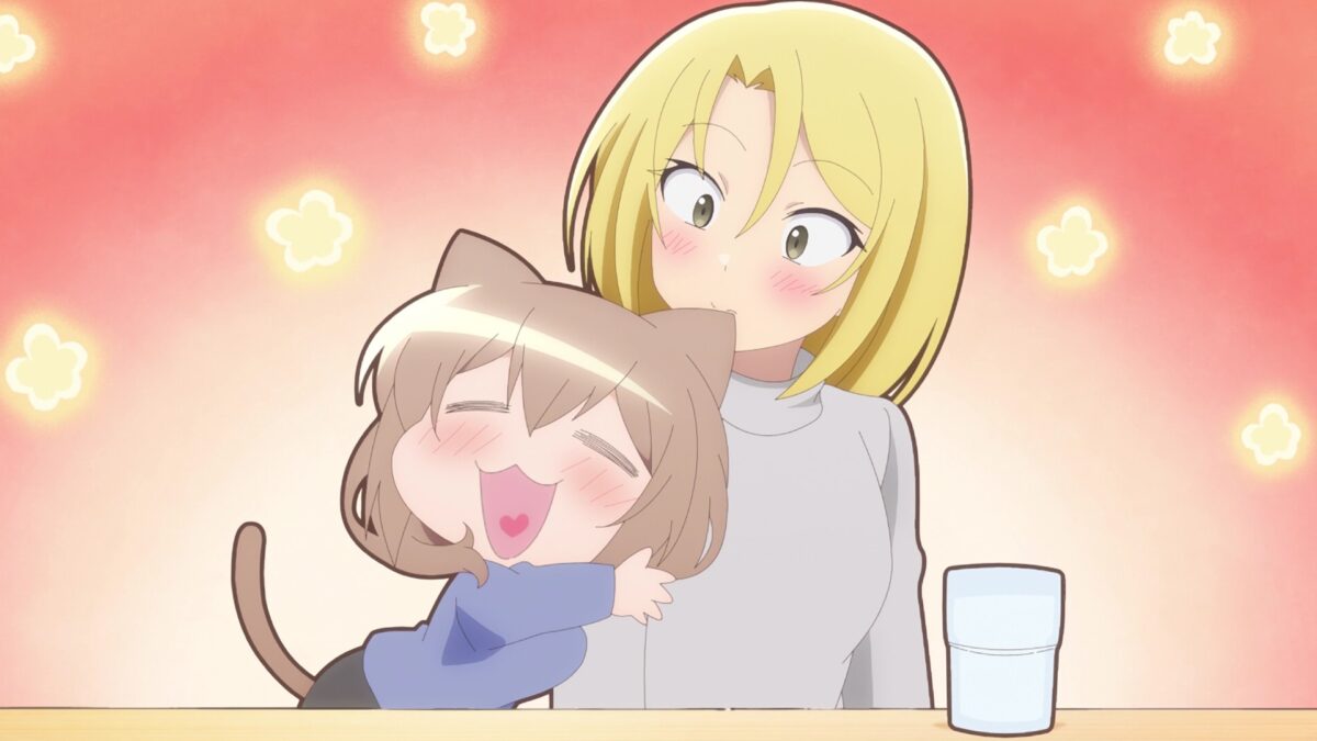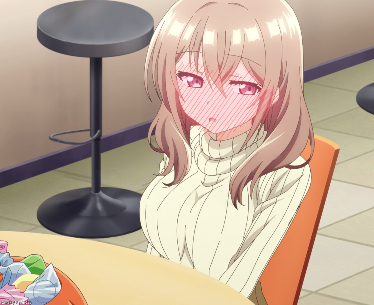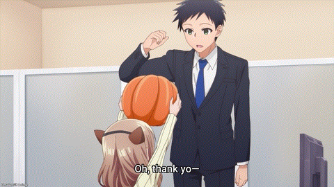 Hey, My Tiny Senpai says, Happy Halloween! Trick or treat! You have to say the magic words, Shinozaki, or you don’t get candy. Everybody gets cat ears. Uh oh. I see fancy chocolate. Someone will get drunk off liqueur-infused bonbons. The smallest one is usually the biggest lightweight. Have fun taking care of tipsy Shiori, Shinozaki! Har! Handfeeding chocolate denial! Shiori brought her smog (smol + smug) face in this episode. Eep. There goes a lovey-dovey drunk. Oh, man. So much giggling. The liquor lifted her inhibitions, so Shiori’s feelings for her colleagues were fully exposed. Smooches for Chinatsu, dogeza (土下座, どげざ — kneeling down on the ground) gratitude for Mr. Manager, and tears of joy for Shinozaki! Oho. There’s the episode title. Shiori isn’t sure how she feels about Shinozaki as a person yet. But does that blush only come from the liquor?