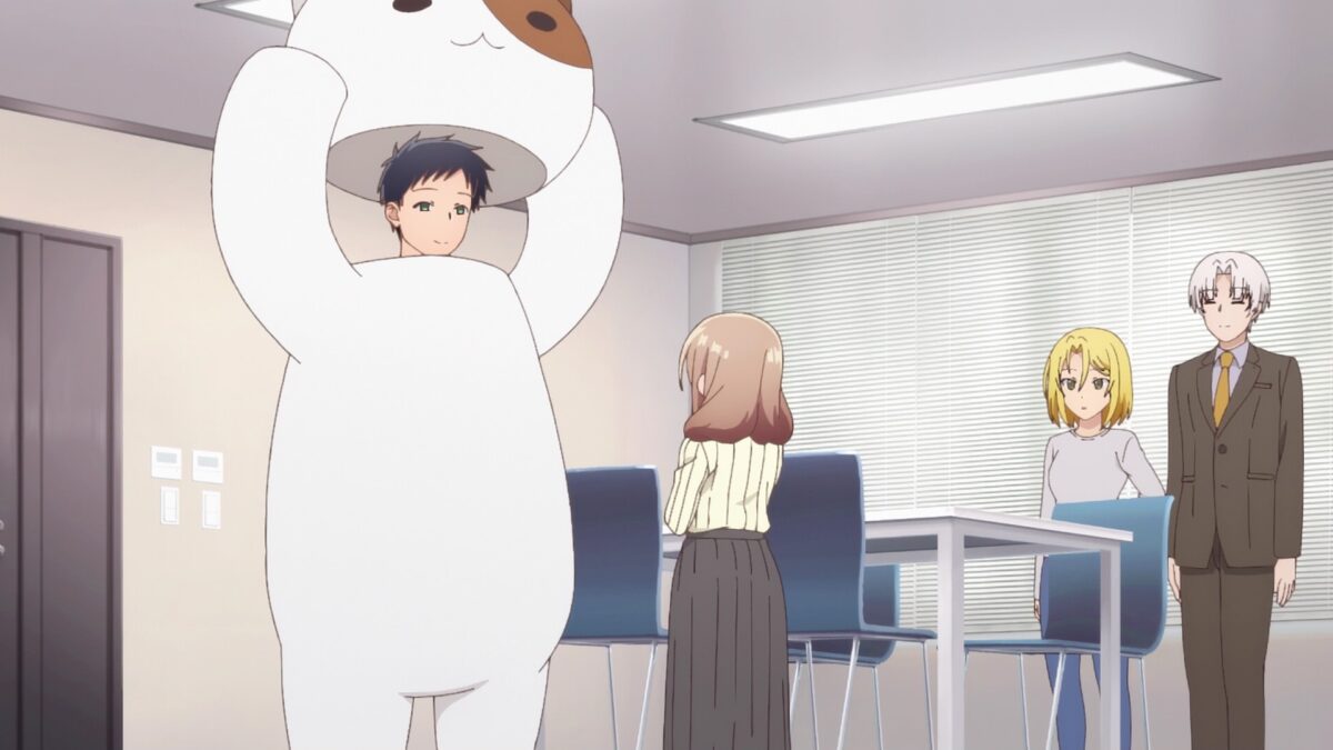 Oh, boo! My Tiny Senpai should have shown us what Akari thought “The Ultimate Meowtaro” looked like. Chinatsu is great! She can do public speaking, geek out on Photoshop, sew sexy costumes, and wear them! She needs to start a Patreon channel. Meowtaro, your buddy, can ride a skateboard and do magic tricks. Sure! My best friends do magic and ride skateboards… I see a whole line of Happy Meal toys from this campaign. Oh no. The girls in the company want to meet Shinozaki now! Shiori likes and hates sharing him with others! Smol yandere! Okay. She can share him for a brief time. Wait a minute. Why does Yuru Meowtaro-Shinozaki not want to hug Shiori? Because he’s not in there! Mr. Manager continues to impress the ladies of the company. No hug for Shiori. So sad.