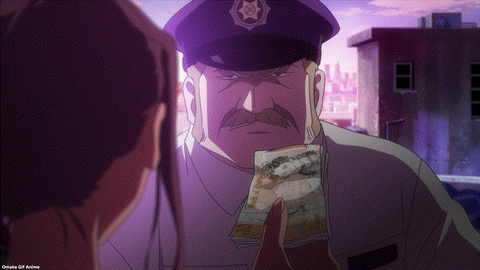 Yup, BIRDIE WING is in a video game world. Look at the architecture of that airport! Nafrece is twelve hours away from Japan. That narrows its location down… The money bills say “Euru” and “Bank of Nafrece.” Generic European metropolis, then. Uh oh. A cop is getting fresh with Klein. Nothing like petty corruption and bribery to start the morning. Also, “Jose Garcia” tequila wakes you up. Time for the moody montage and insert music for the episode.