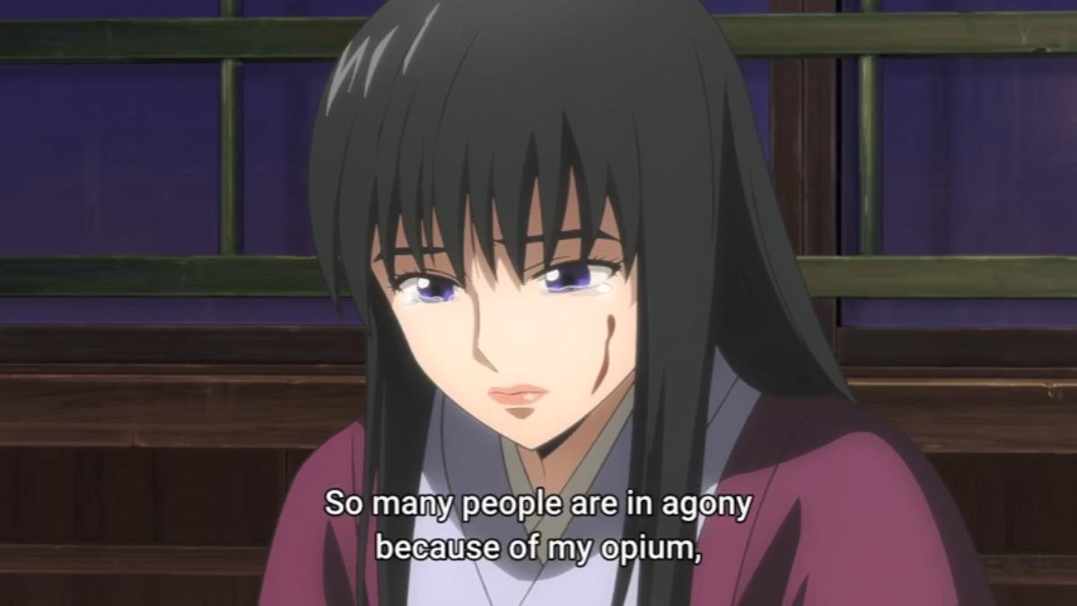 The scene plays out differently from here. In the past, the scene cut straight to the Kamiya Dojo. The 2023 version sees Megumi give Kenshin something for his chest wounds, inform them of a secret escape passage, and leave to turn herself over to the police. Just as she was about to confess, Kenshingumi arrived and lied to the police to protect her. Kanryu was silenced by Kenshin’s sharp battosai glare. He then explains his path of atonement and urges her to become a doctor to make up for the lives her opium took.