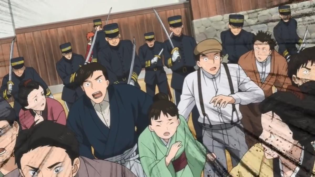 None of that happens in the 2023 version. Instead, events from 1996’s episode 3 happen. Kenshin is drawn into a fight with the Sword Bearing Police. He wins of course. They’re glorified thugs. Afterwards, he is met by his old friend Yamagata Aritomo. This character is based on a real historical figure. These events take up time that could have been spent resolving Yahiko’s arc. The episode ends with Yahiko on the ground in front of some scary yakuza guys, getting beaten with a stick when he decides to stop being a pickpocket.