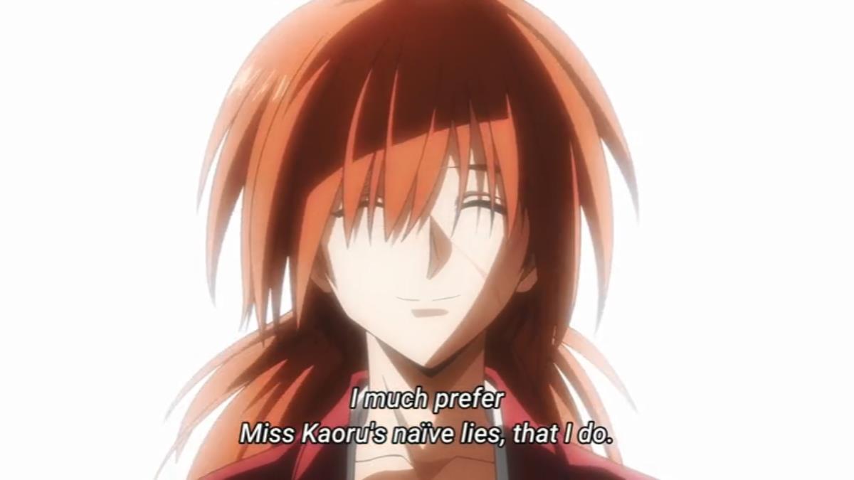 Maybe it’s a bit late to touch upon this, but the title sequences in the 2023 iteration just bore me. White text on black background greets viewers at the start and the end. There’s no narration, either. As seen above, the 1996 version has stylized portraits of Kenshin or Kaoru at the beginning to announce far better-sounding episode titles. Granted, Kenshin declares the title names at the end of the 2023 episodes, but it’s not the same. The endings for the 1996 episodes have Kaoru narrate the plot of the following episode, with white text over a still frame from that episode.