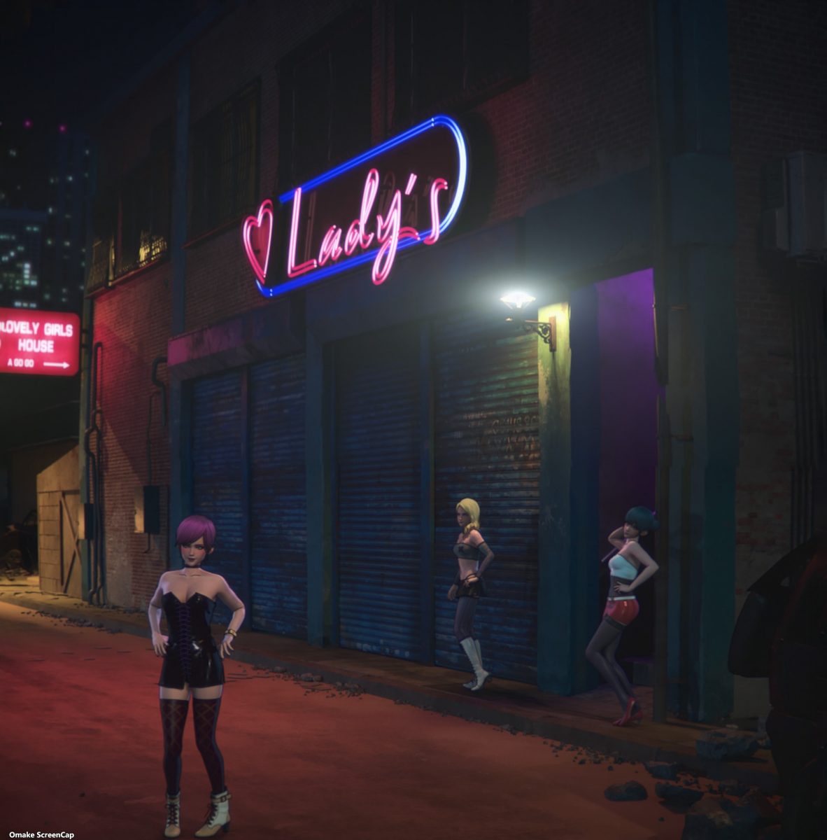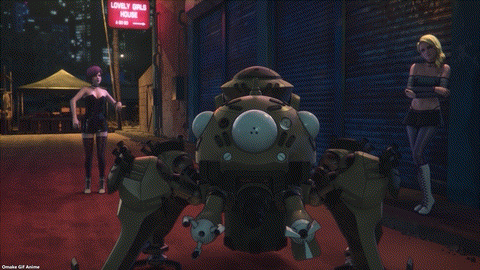 Togusa says the Tachikoma are a tighter fit than he remembered. Are the Tachikoma showing tact that their redesigns are for cyborg bodies and not mentioning Togusa gained weight? SAC_2045 showing the progression of time on Togusa’s dad bod. Oh, it’s those lovely ladies of the evening again. How did the Tachikoma negotiate space next to the “Lovely Girls House?” Aw. The olive drab Tachikoma is happy to see Togusa too. Why is it pointing out the cute girls? And giggling about it? Is it trying to upsell their business? Maybe it’s just friendly that way. I’m curious how these Tachikoma are making money to buy parts for the injured one.