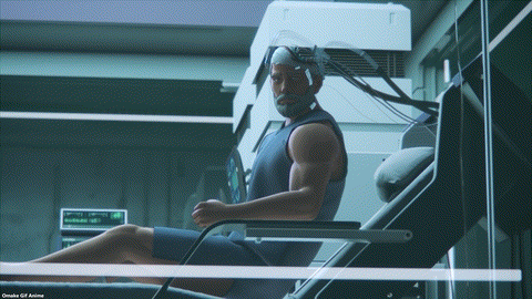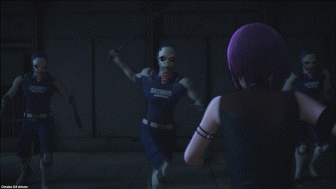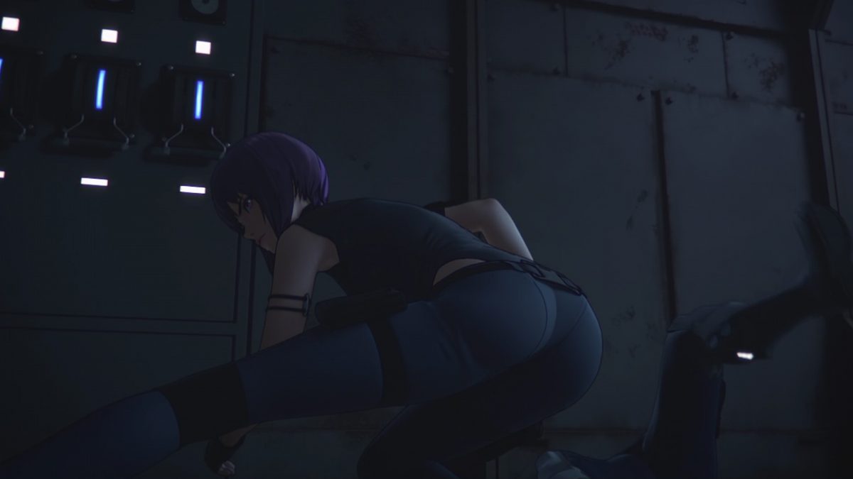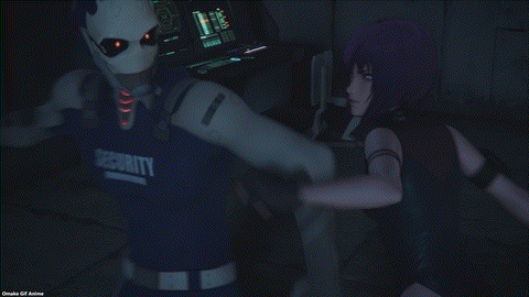 Oh boy. Harts just refocused after the Tachikoma unplugged. Did he change his objective? Can’t SAC_2045 ever make Motoko fight in optimal lighting conditions? How am I supposed to admire that CGI posterior? These security robots pop out of the ceiling like The Flood in Halo. Post-humans sure are creepy. This is the worst looking bar brawl ever. Aramaki and Smith need a whiskey bottle and a beer mug to smash a bot’s head. Maybe Harts decided to commit suicide since he already saved himself in Tachikoma’s memory?