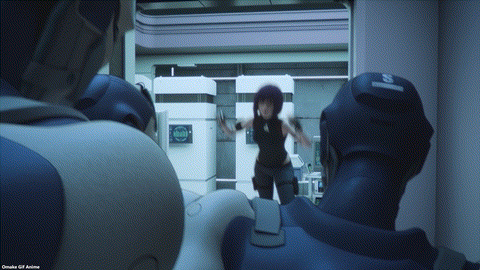 Things are about to get crazy in SAC_2045. Motoko noticed that Harts kept catching his paper airplane by predicting ambient air conditions. When that changes, watch out! Here it comes! And there it goes! Harts took control of the facility! Hacked robots incoming. They look like fast walker zombies. Huge’s combat maids were much easier on the eyes.