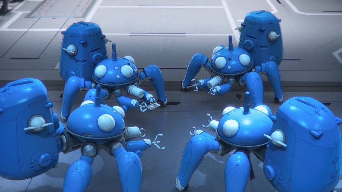 Ah hahaha! The Tachikomas are enjoying Batou’s show! This is so good. I’m giddy about the comedy writing! And the Tachikomas are all back in their garage, ready to gossip about the other Section 9 members. Man! SAC_2045 really brought all the best parts of Stand Alone Complex back together. Wow. Production I.G and Sola Digital Arts did a good job with the writing and direction.