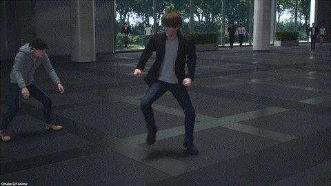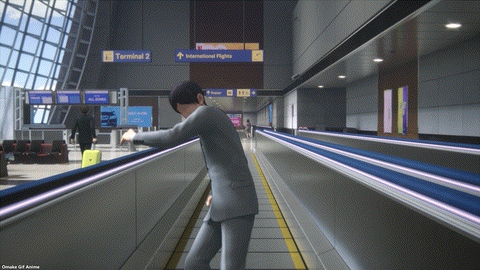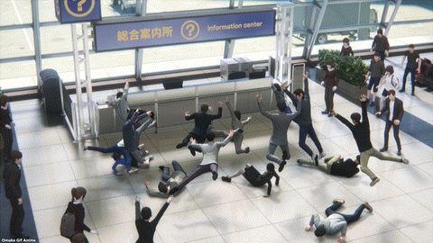 Whoa. A literal Internet mob killed an air traveler. SAC_2045 makes a great metaphor for anonymous faceless mobs of Internet rage with these eyeless faces. I wonder what this whole scene looked like from the outside. Did the cyber punches and kicks bruise the poor guy, or did he get his injuries only from his falls? Obviously, the mob attack fried his cyberbrain somehow.