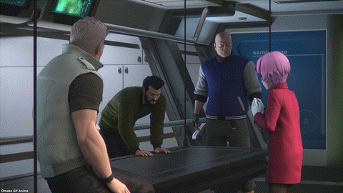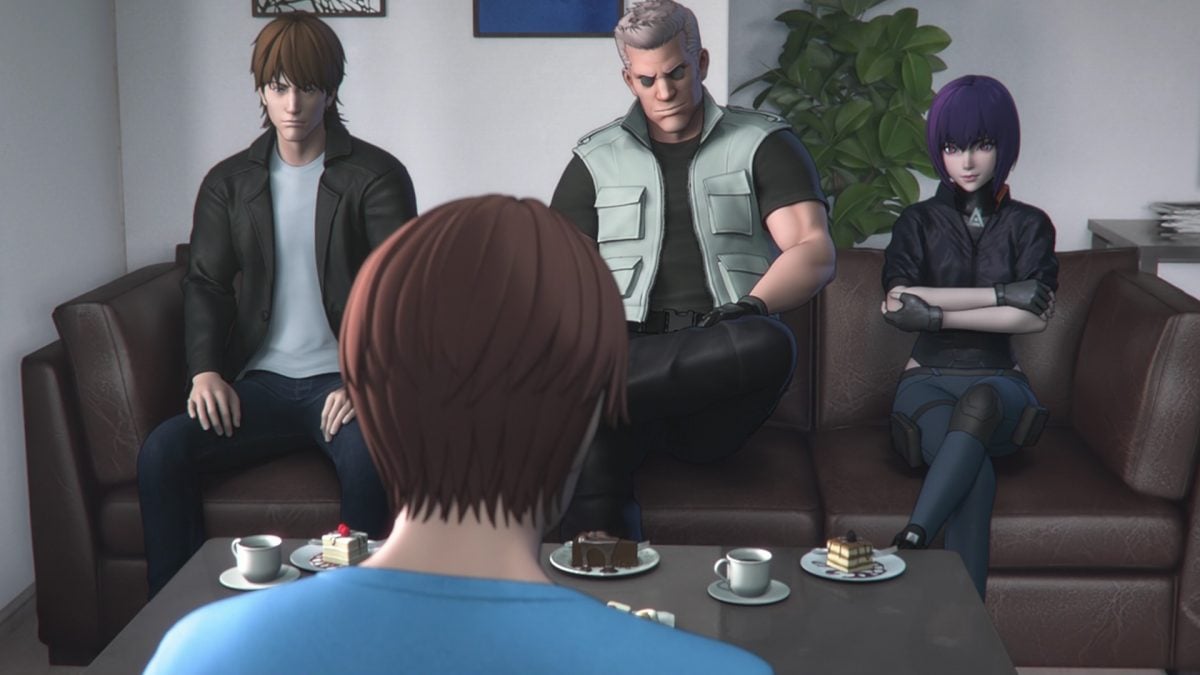 In the debrief, Section 9 keeps showing pictures of the messy-haired post-human, so I assume he’s the original programmer of Think Poll. Batou gave Purin a compliment but told her to be more careful. They were watching her the whole time! SAC_2045 has a new thing called “being wired” that lovers do. I need more specifics on this, especially if Purin offers to do it with Batou and he rejects it like her mixtape. Look at that pout! Motoko looks like she’s having fun watching all this play out.