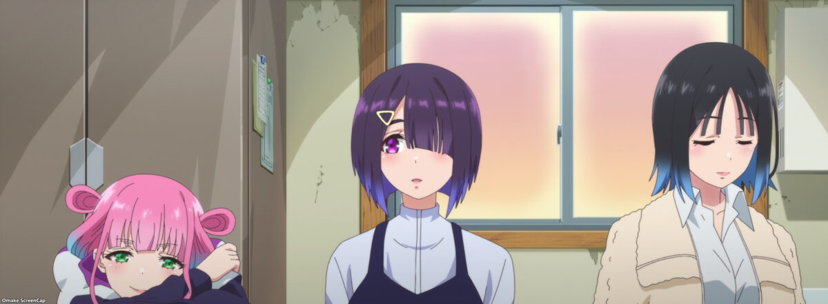 Kouyou starts his dorm caretaker duties immediately. Cooking, cleaning, and laundry. How soon before the accidental peeping and underwear-stealing scenes happen? She’s so mean! Aroma hasn’t forgiven Kouyou for invading the all-female space yet. Plus, he “felt her up all over.” But didn’t the pervy groping “loosen” her up? I’ll bet it did! Aoba would rather not hear Aroma yelling so loudly at the breakfast table.