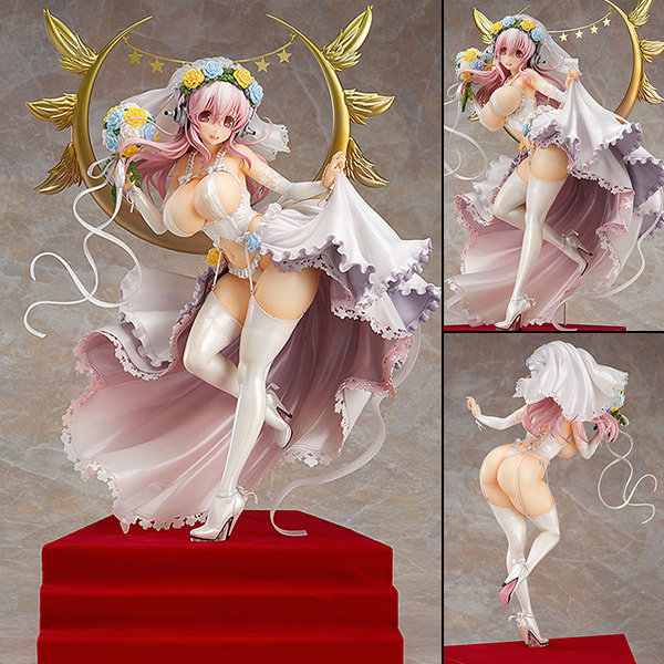 The figure is based on an original illustration by Tsuji Santa and has been sculpted in 1/6th scale to capture her impressive dress and sexy appearance in lovely detail! The wedding dress is an original design made especially for Sonico, bringing out her charm as much as possible for fans to enjoy by their side. She also comes with an alternate expression part to display her ready to tie the knot with her wedding kiss! Be sure to add this Sonico to your collection as your bride!