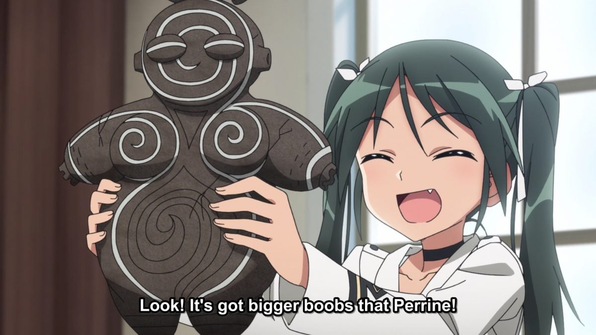 Okay, Lucchini should talk. That idol made her boobs bigger. That’s right! Yoshika loves big boobs! She’s our special little lady and a true hero of culture in Strike Witches. There are so many things going on! Yoshika’s magic sprang out. Oppai is the source of all power! Shirley and Perrine have been through this stuff before. Shizuka is “earning her wings” in Yoshika’s boob related magical adventures. She’s in for a treat. The audience is too! And now Lucchini talks like a monkey. Kekekeke. The clay idol is moving around too.