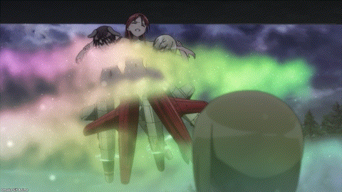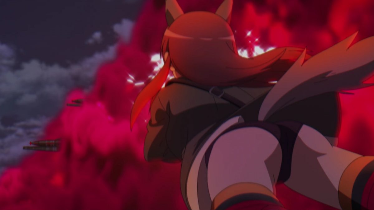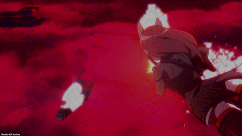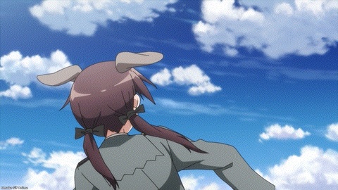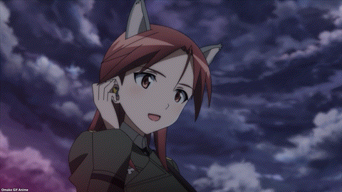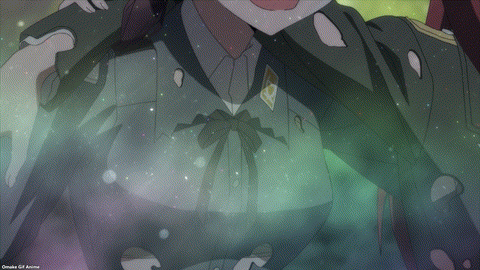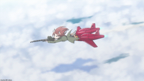 Strike Witches made the Wolf Nest over Berlin smart. Trude and Erica know how to beat the NX-30 Neuroi, but it’s still tough. The blue jet color of Minna’s magic reminds me of the great contrast witches have with the Neuroi red laser power. It’s way too early in the episode to celebrate. Yup. That’s a lot of rockets! Minna had a great back and forth battle and then she had a moment to choose self-sacrifice. Minna (voice actress Rie Tanaka) has a great singing voice too. Of course, Trude and Erica rescued her because Strike Witches always save each other. Trude is such a softie.