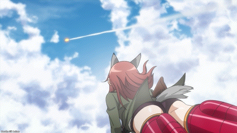 The Komet’s test flight shows the Strike Witches why it suits Minna’s powers the best. Her dimensional mapping sense lets her fly at supersonic speeds without diverting her focus to aiming weapons. Sonic boom! Dynamite ass! Got it. Minna looks tired, but it’s not related to the jet fuel mixture.