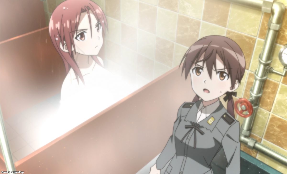 The truth comes out in the bath, as it usually does in Strike Witches. Trude accused Minna of already starting to lose her magic. Both feel the crush of a deadline weighing them down. Minna is desperate to pilot the Komet.