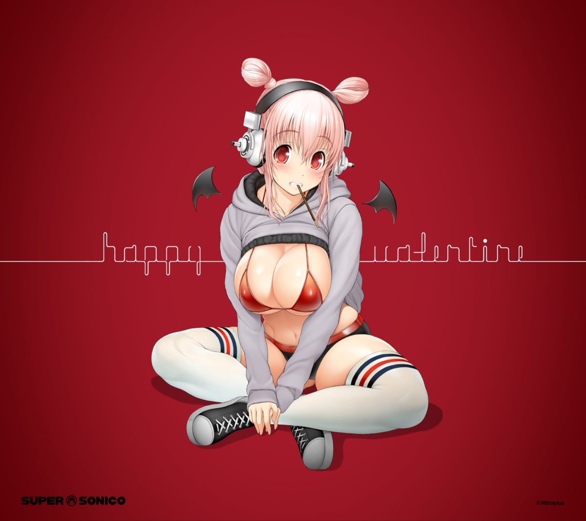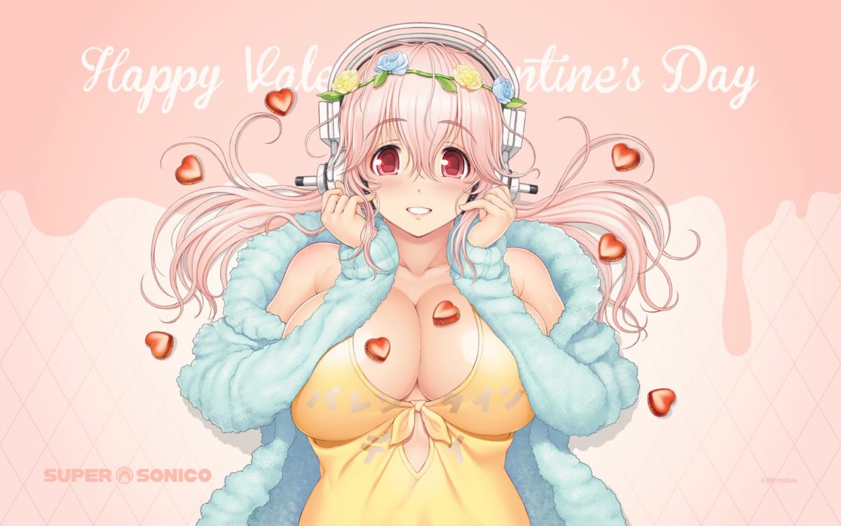 In 2017, a limited time Valentine’s themed wallpaper illustration was released which features Super Sonico wishing you a happy valentine with heart-shaped sprinkles on a chocolate covered strawberry between her cleavage.