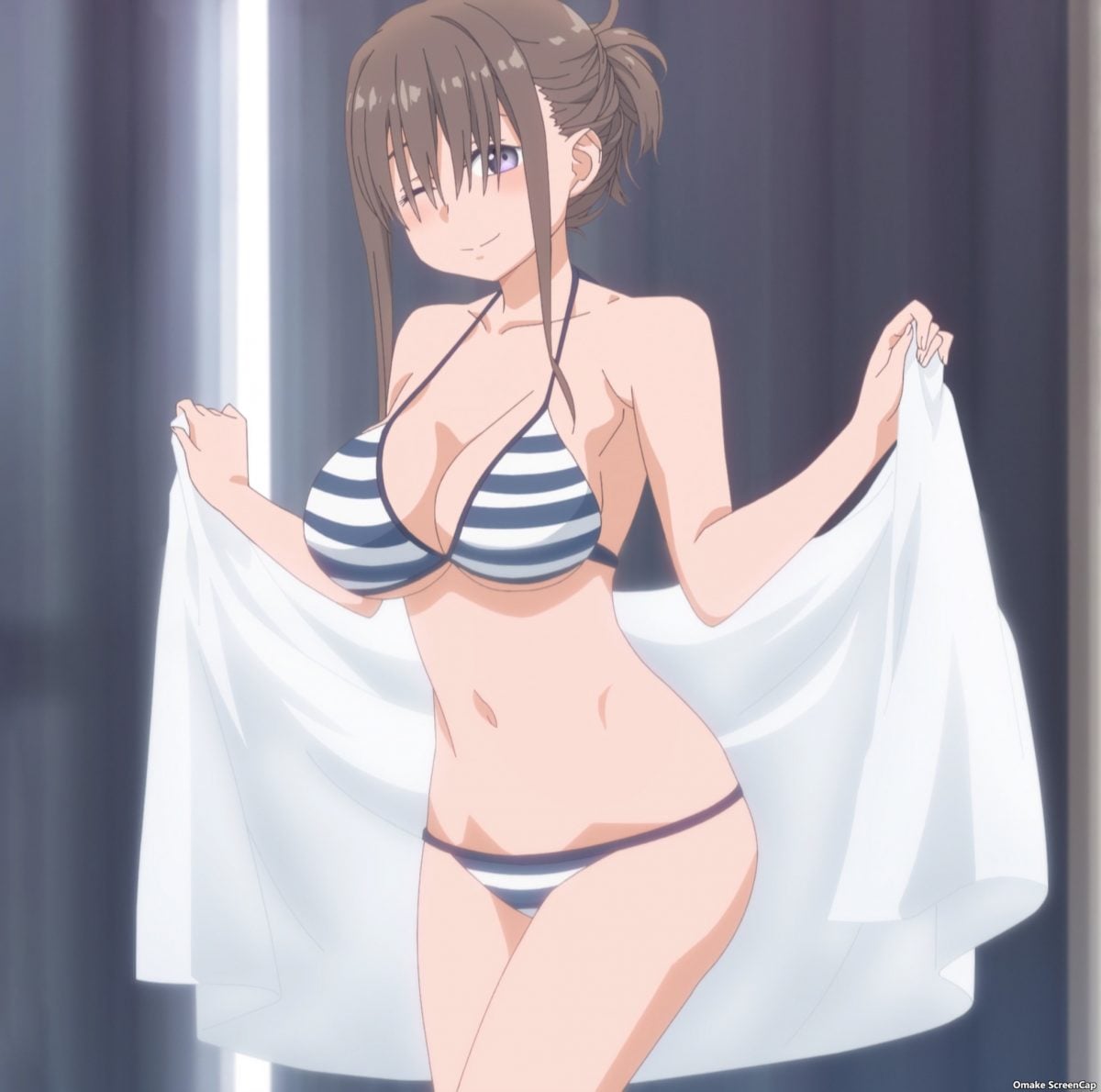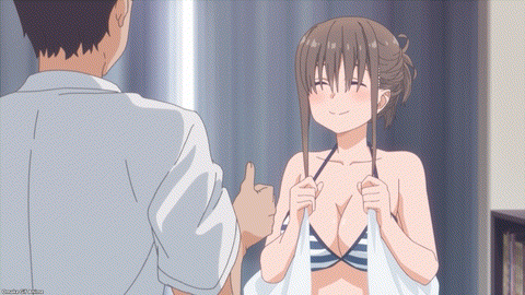 Oh wow! Tawawa on Monday starts off with a bang! Or a boin? Bangs-chan wants to go to the beach, and she has the right gear to show off her weapons. Oops. Sensei likes the bikini but doesn’t want her displaying that bodacious body in public. Did Bangs-chan make a tactical blunder by giving him the bikini show before going to the beach? She hammers at Sensei’s willpower with two heavy guns. His defenses hold firm. Kill shot! A private showing of the tan lines! Sensei never stood a chance against Bangs-chan’s full-body press and persuasive charms. Now, when do we see that beach episode?