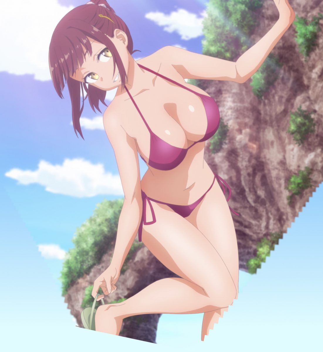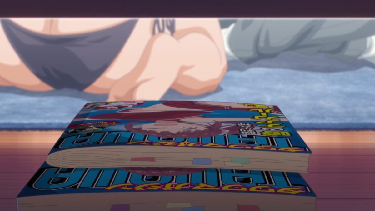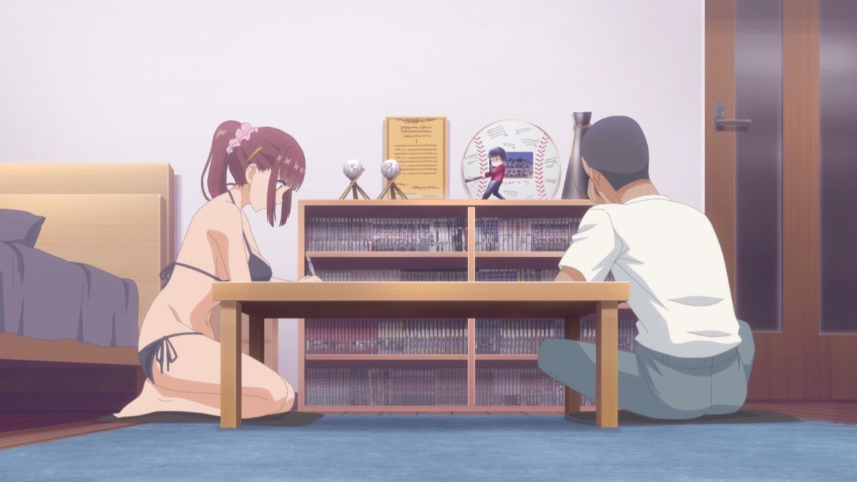 Ha! She’s not here to make up for dragging him into the spotlight. She wants to copy his homework! She brought extra incentives. That red bikini shoot was Baseball Club-kun’s favorite! Uh oh. Did she go too far? Will he and Cheer-chan become the next official couple in Tawawa on Monday?