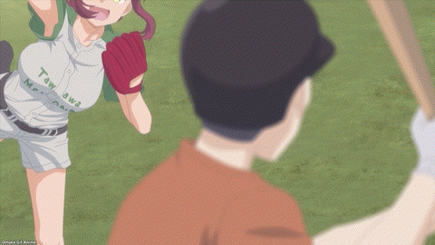 Nah! Baseball Club-kun stuffed his notebook in her cleavage. I don’t think this will become the next #tawawachallenge after the #tapiocachallenge. Cheer-chan offers extra service for him while she copies his notes. That means she wants something else. Oh? She wants to practice throwing a baseball around. Why?