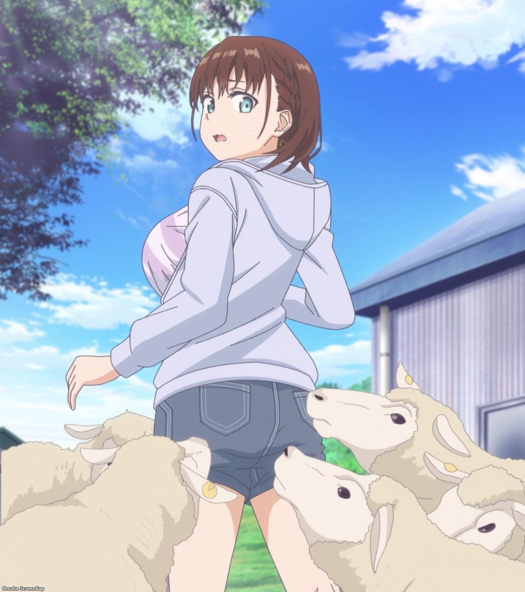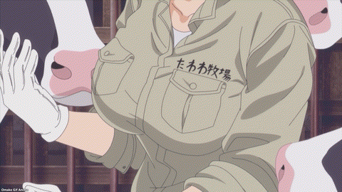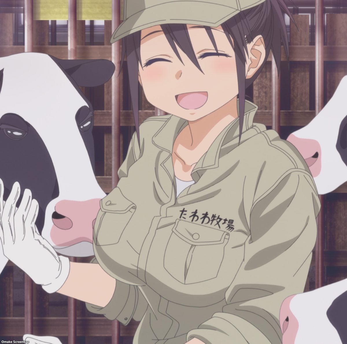 Alright, alright, alright! Oniisan and Aichan are on a date! It’s a day trip to the Tawawa Farm. It’s a dairy farm, so we should see more milk jugs than usual for this show. Ha! Do you remember when the Boba Challenge was a thing? Aichan is well-qualified for “Booba.” Nice. Tawawa on Monday satisfies that strap cleavage fetish. Aichan claims that seatbelts don’t get along with her. The safety belt is just hugging her close. That’s all. Har. Oniisan hasn’t been getting much sleep because of his noisy neighbors. Bangs-chan demonstrates her affection for Sensei in late-night high-decibel ways. There’s Tawawa Farm. Bring on the dairy farm girl jokes!