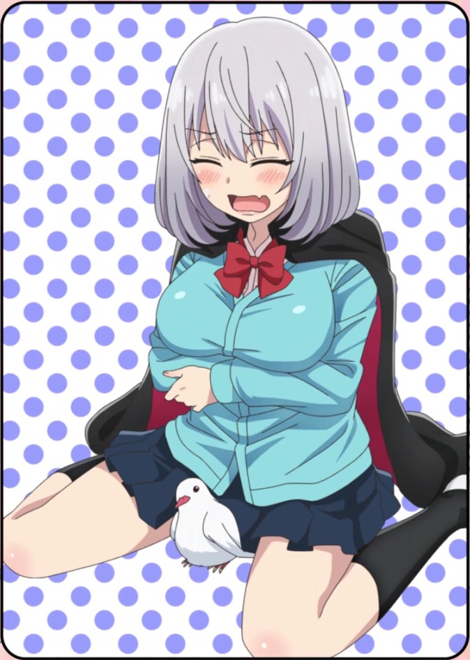 Ouch! The bird pecked Tejina-sempai! Poor girl. Tejina-sempai keeps birdseed in her chest. Instead of eating off her hand, the bird goes straight for the seed source! Smart bird.