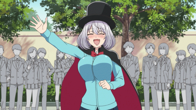 Judging from the opening credit scenes, it looks like there will be lots of fun characters with big personalities, and that’s not just a metaphor either. Tejina-sempai appears to have three modes: magic show, sharing a bad idea, and begging for help. Her club sign, unofficially attached to another sign tells us it’s the 奇術 (kijutsu) Magic Club, where Tejina is Magical Sempai.